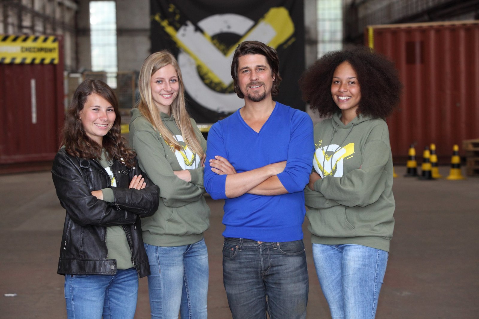 Moderator Tommy Scheel mit dem Mädchen Team von Checkpoint: Maja, Charlotte, Tommy Scheel unf Charlaine. V.l.n.r.Bild: © ZDF/ Frank W. Hempel