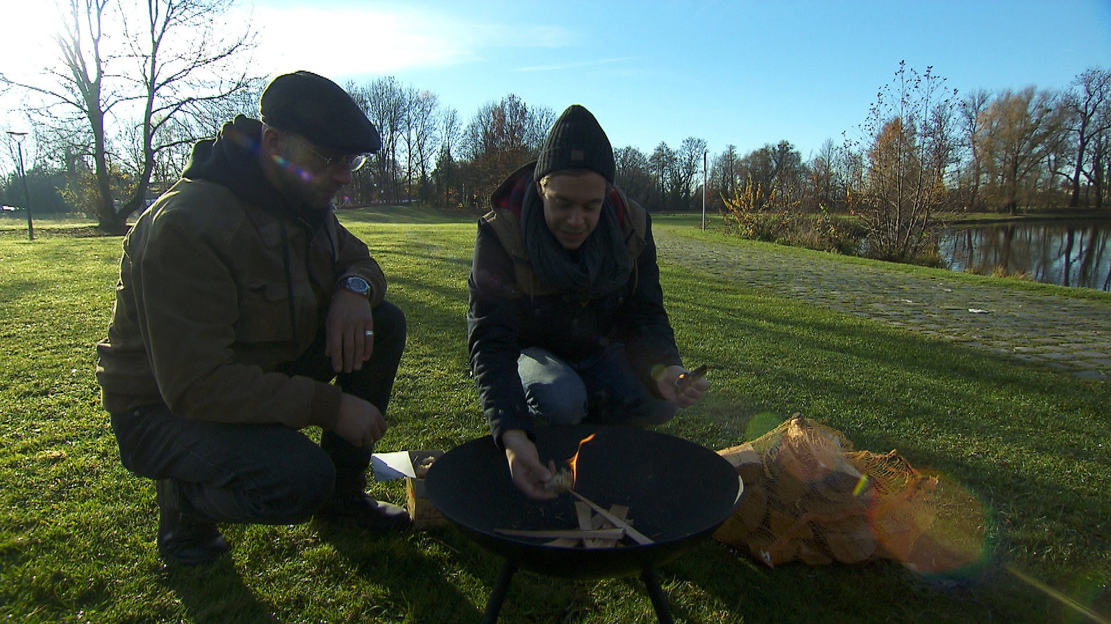 Aus der Ferne Feuer löschen?!Checker Tobi (rechts) und Herausforderer Michael Fuchs entfachen ein Feuer.Bild: © BR/megaherz gmbh/Hans-Florian Hopfner