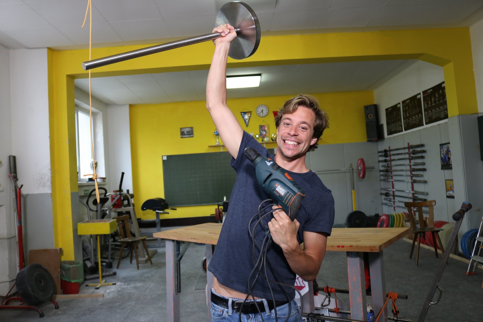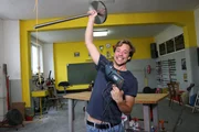 Stärker als Herkules?!Tobi muss dieses Gewicht am Ende der Stange über seinen Kopf heben. Das geht nur, wenn sich die Scheibe besonders schnell dreht.Bild: © BR/megaherz gmbh/Mathias Hagn