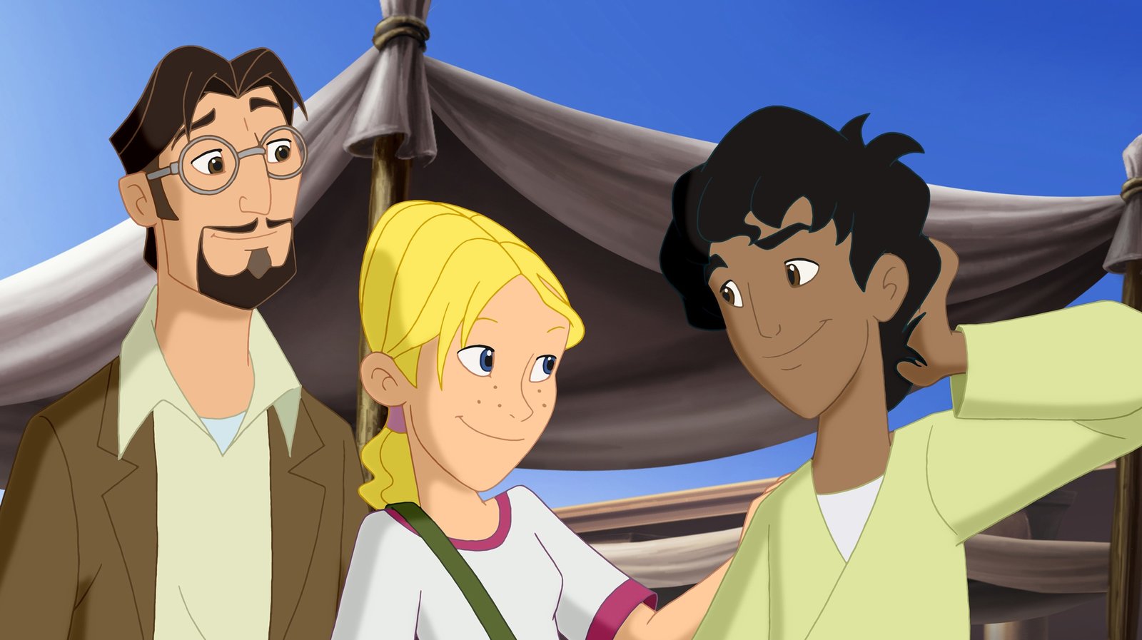 Versprochen - Eine neue HeimatBibelexperte Professor Petersen (li.), seine Tochter Cora und Straßenjunge Habib aus JerusalemBild: © KiKA/Cross Media/Beta/Trickompany 2010