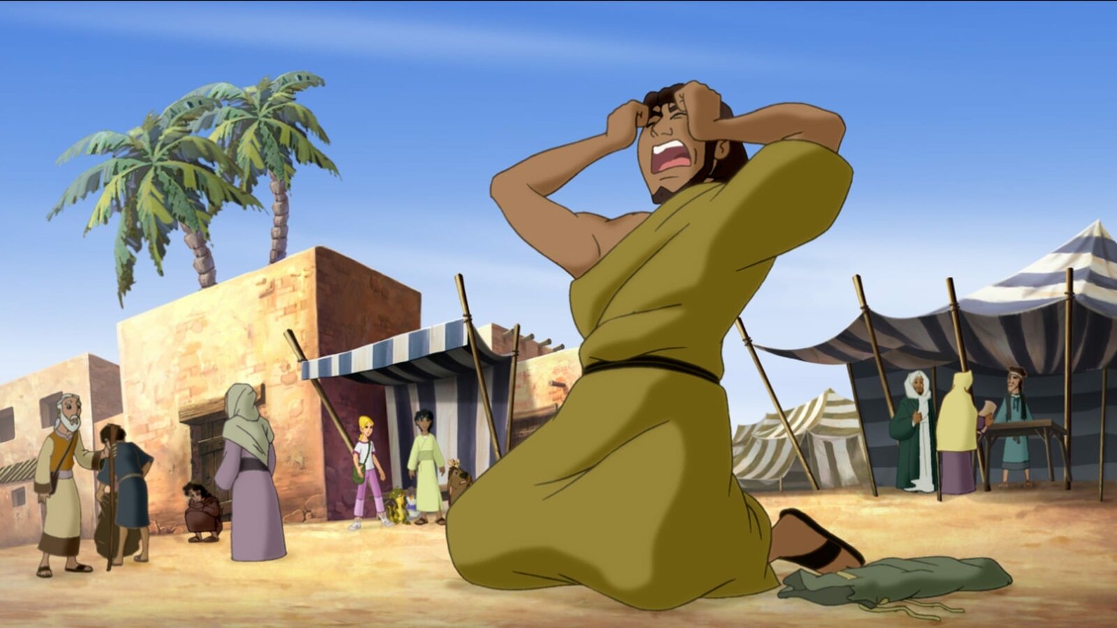 Geschenkt - Die zehn GeboteHabib und der Samariter (li.) beeilen sich, um dem Verletzten am Wegesrand zu helfen.Bild: © KiKA/Cross Media/Beta/Trickompany 2010