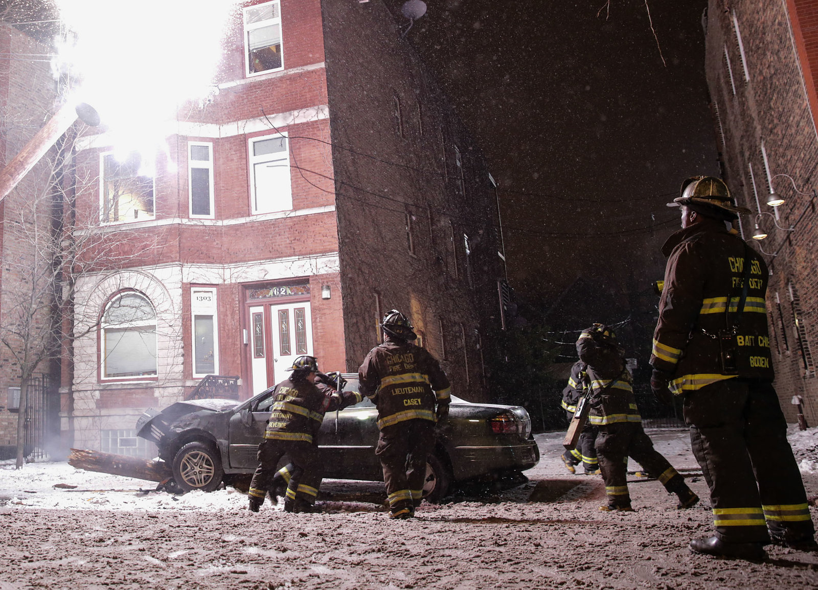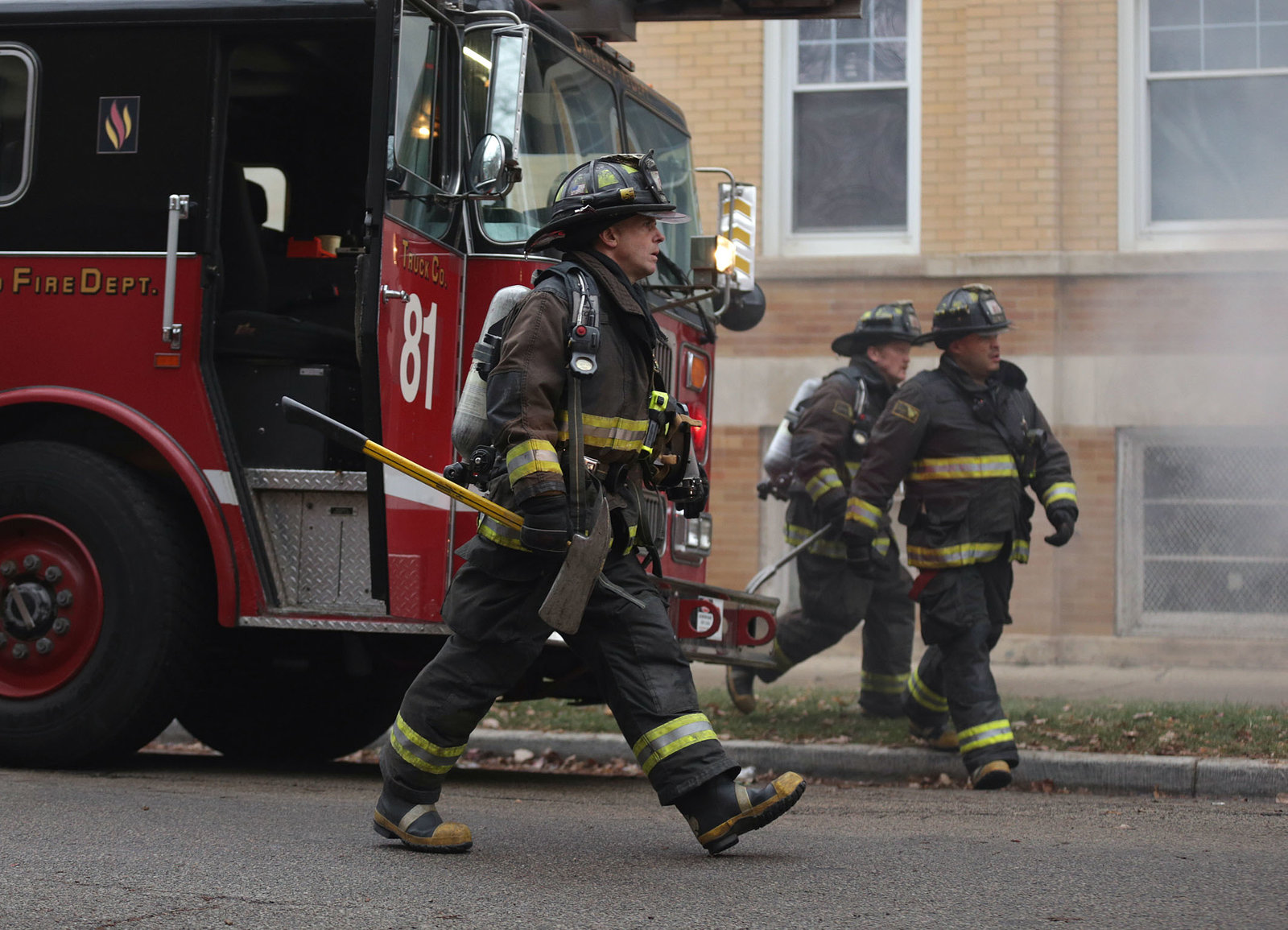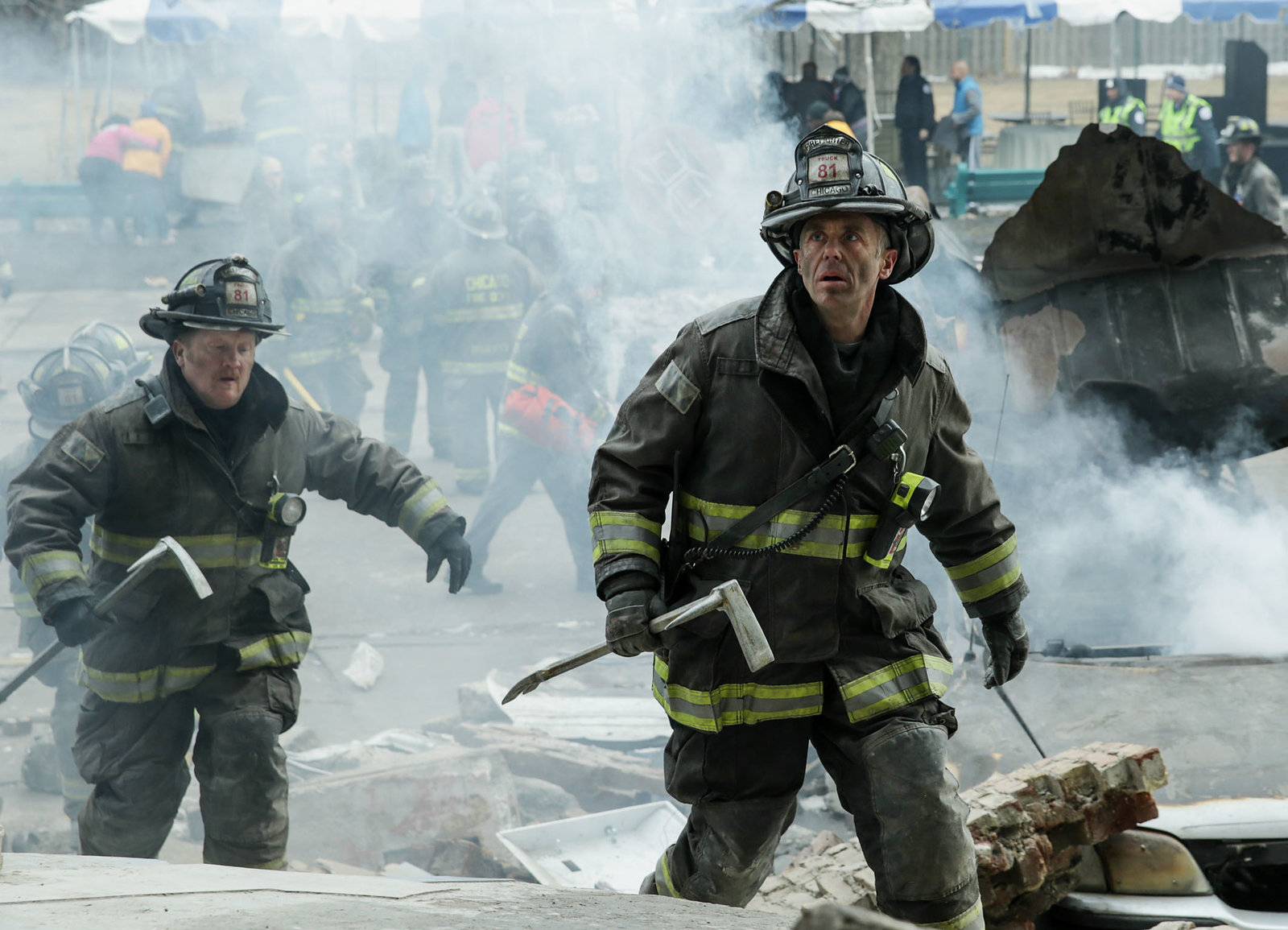 EinschlägeAuf dem Weg zum Einsatz: David Eigenberg als Christopher Herman, Christian Stolte als Mouch, Joe Minoso für Joe CruzBild: © SRF/NBC Universal