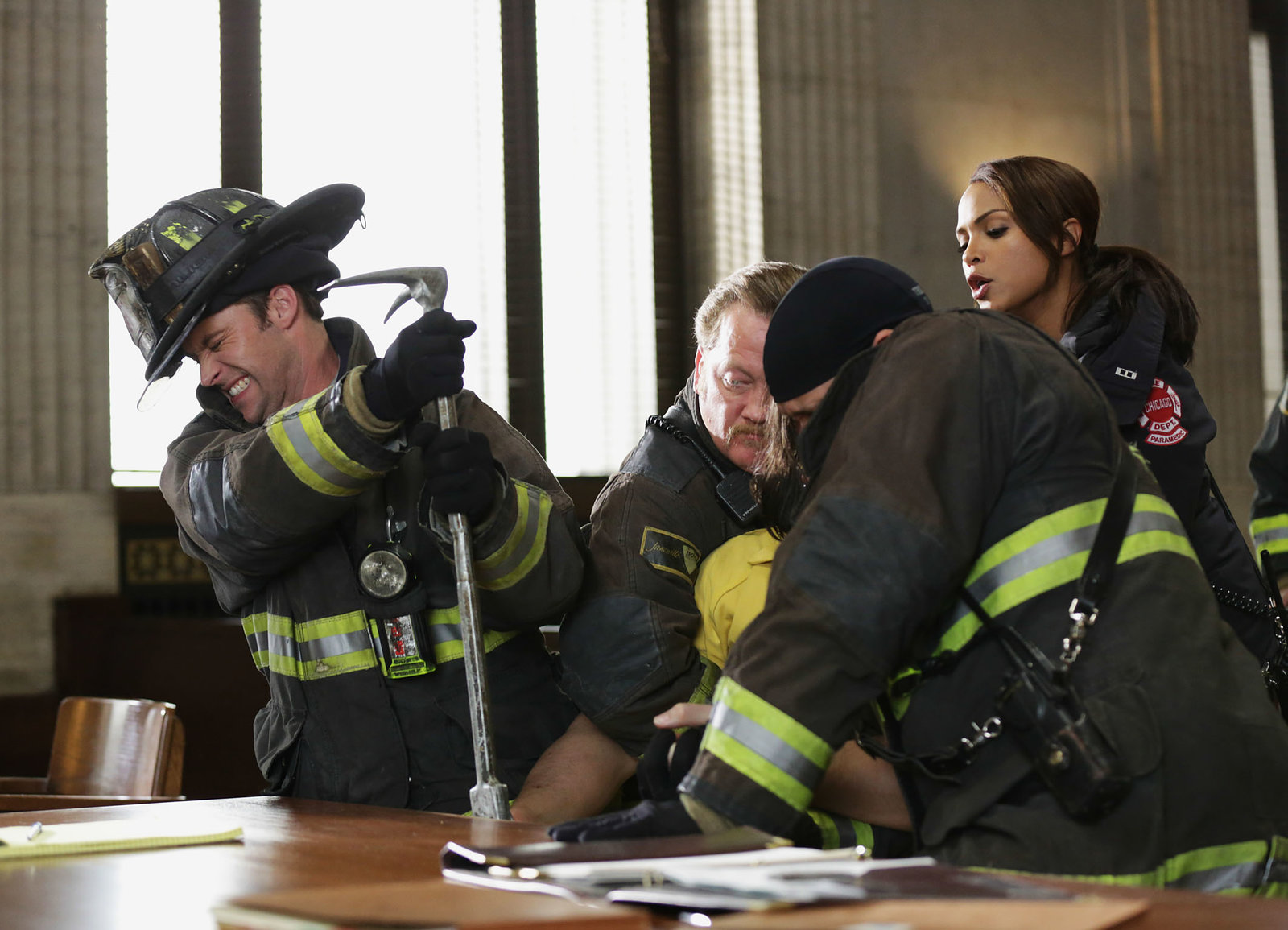 Augen auf, Mund zuEinsatz im Gerichtssaal: Taylor Kinney als Kelly Severide, Christian Stolte als Mouch, Joe Minoso als Joe Cruz, Monica Raymund als Gabriela DawsonBild: © SRF/NBC Universal