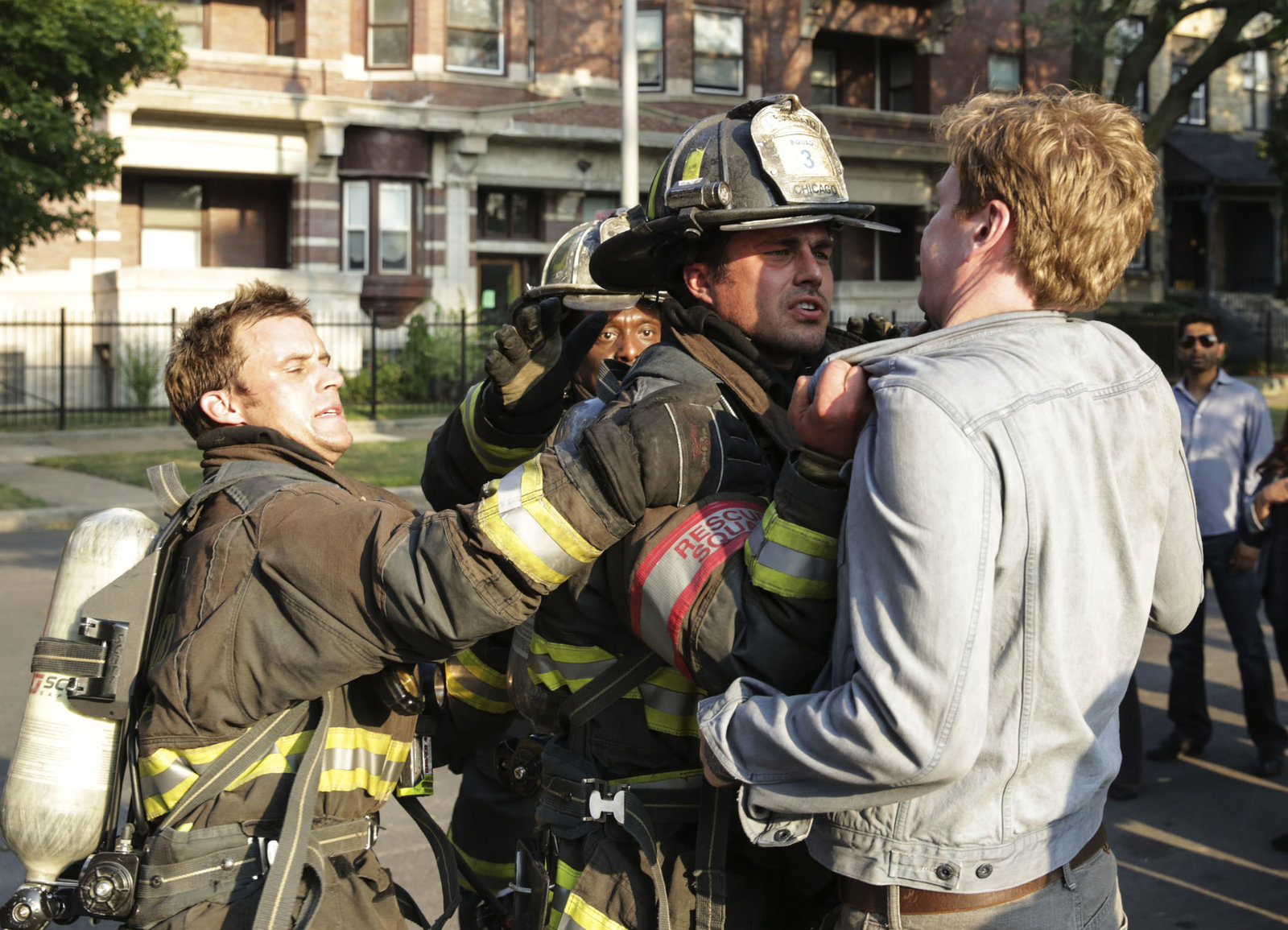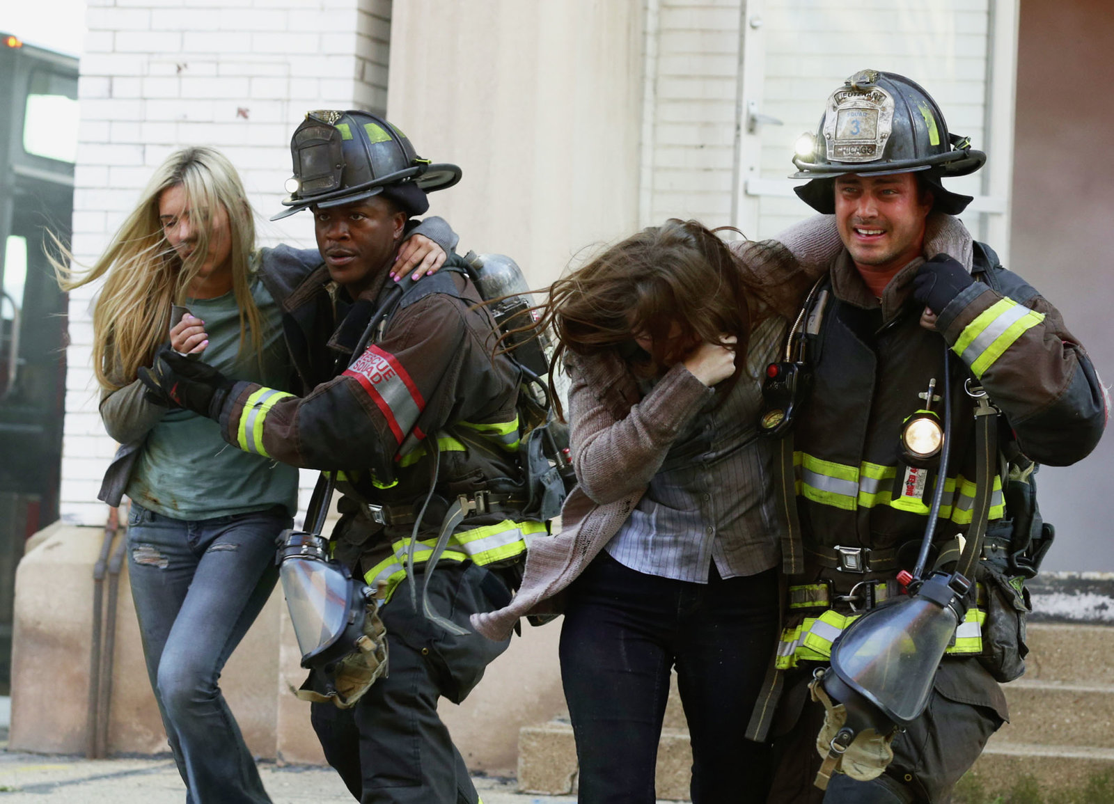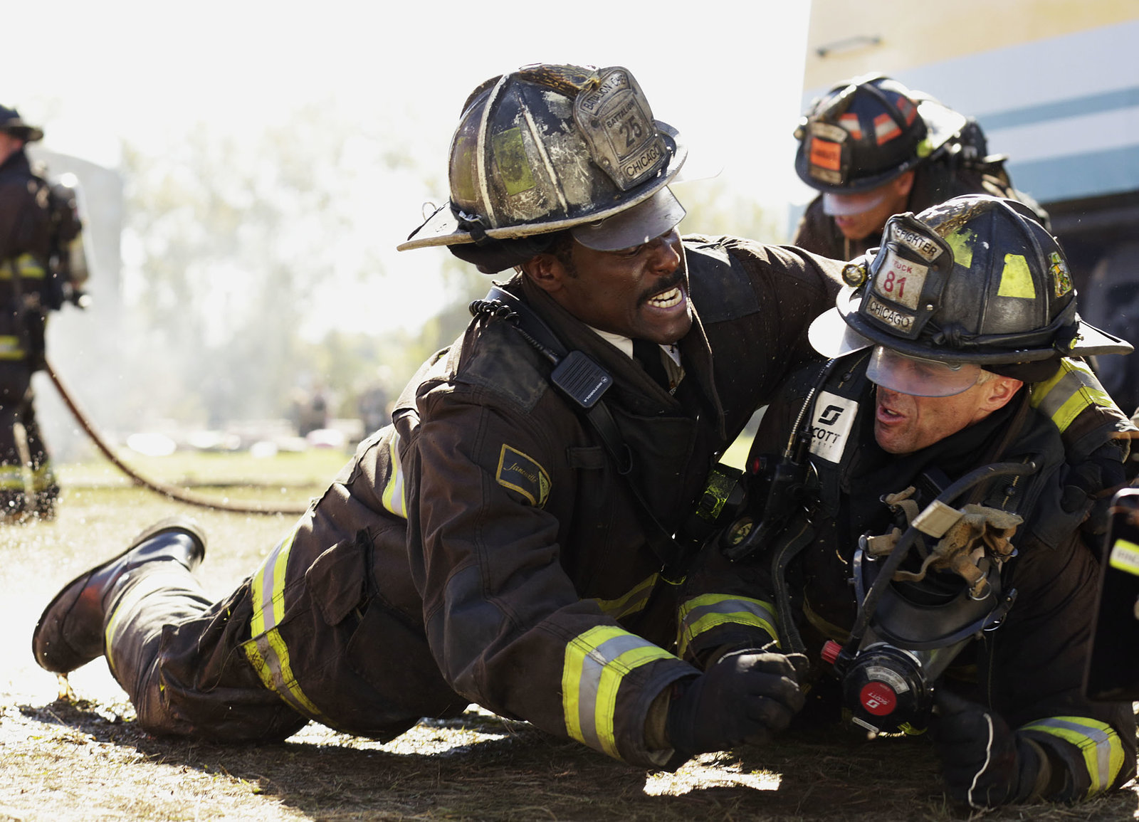 SeitenwechselRettung: Laroyce Hawkins als Kevin Atwater, Taylor Kinney als Kelly Severide, Jesse Spencer als Matthew CaseyBild: © SRF/NBC Universal