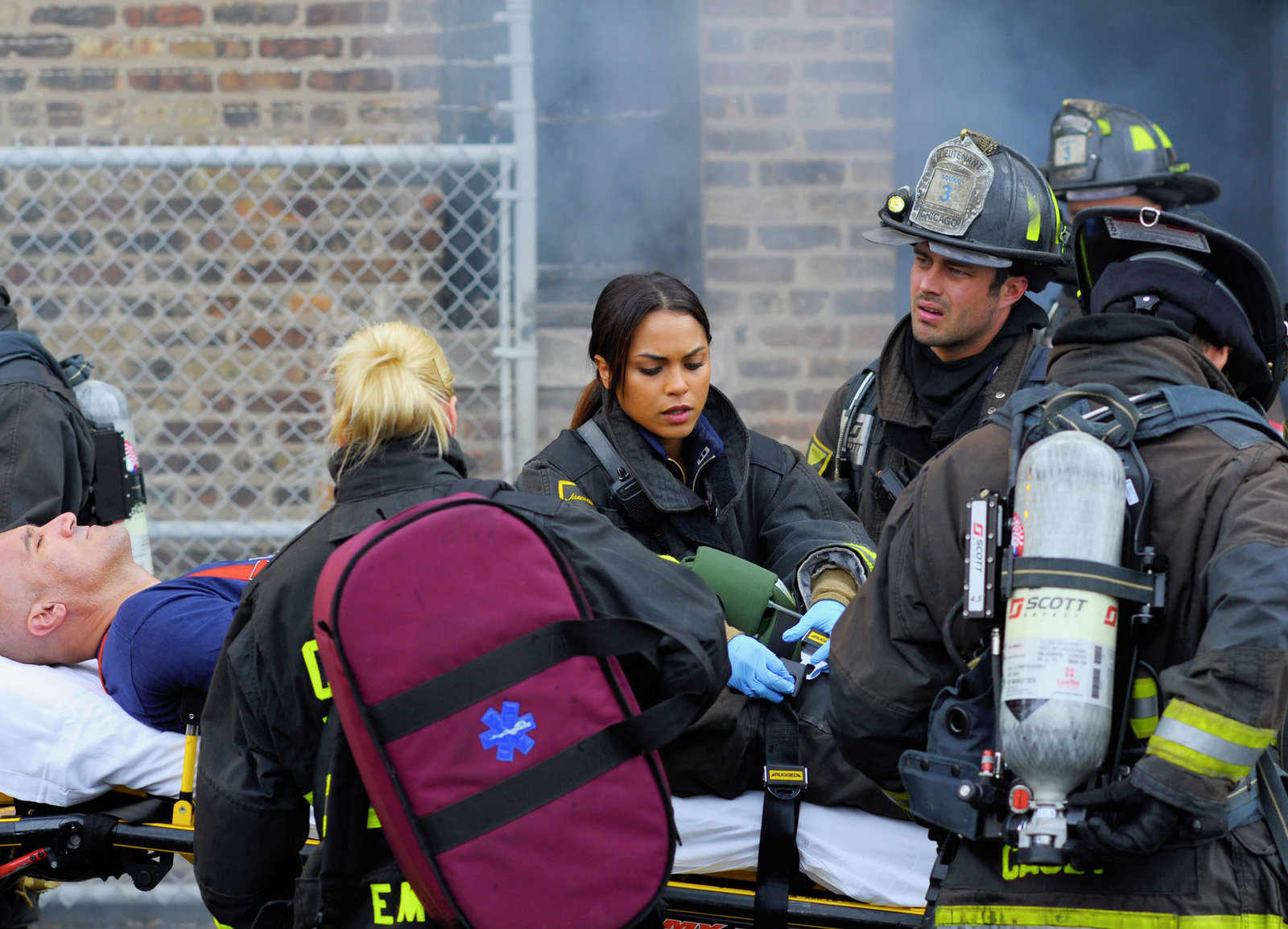 Der letzte EinsatzVersorgen ihren verletzten Kollegen: Mo Gallini als Jose Vargas, Lauren German als Shay, Monica Raymund als Gabrielle Dawson, Taylor Kinney als Kelly SeverideBild: © SRF/NBC Universal