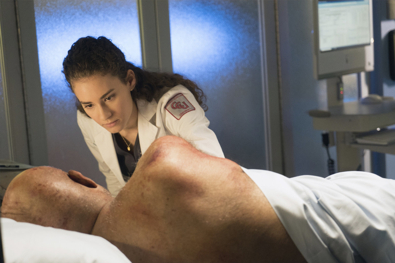 Im Zwiespalt-- "Choices" Episode 109 -- Pictured: (l-r) William Stanford Davis as Ed Brennan, Rachel DiPillo as DrBild: © Universal Channel