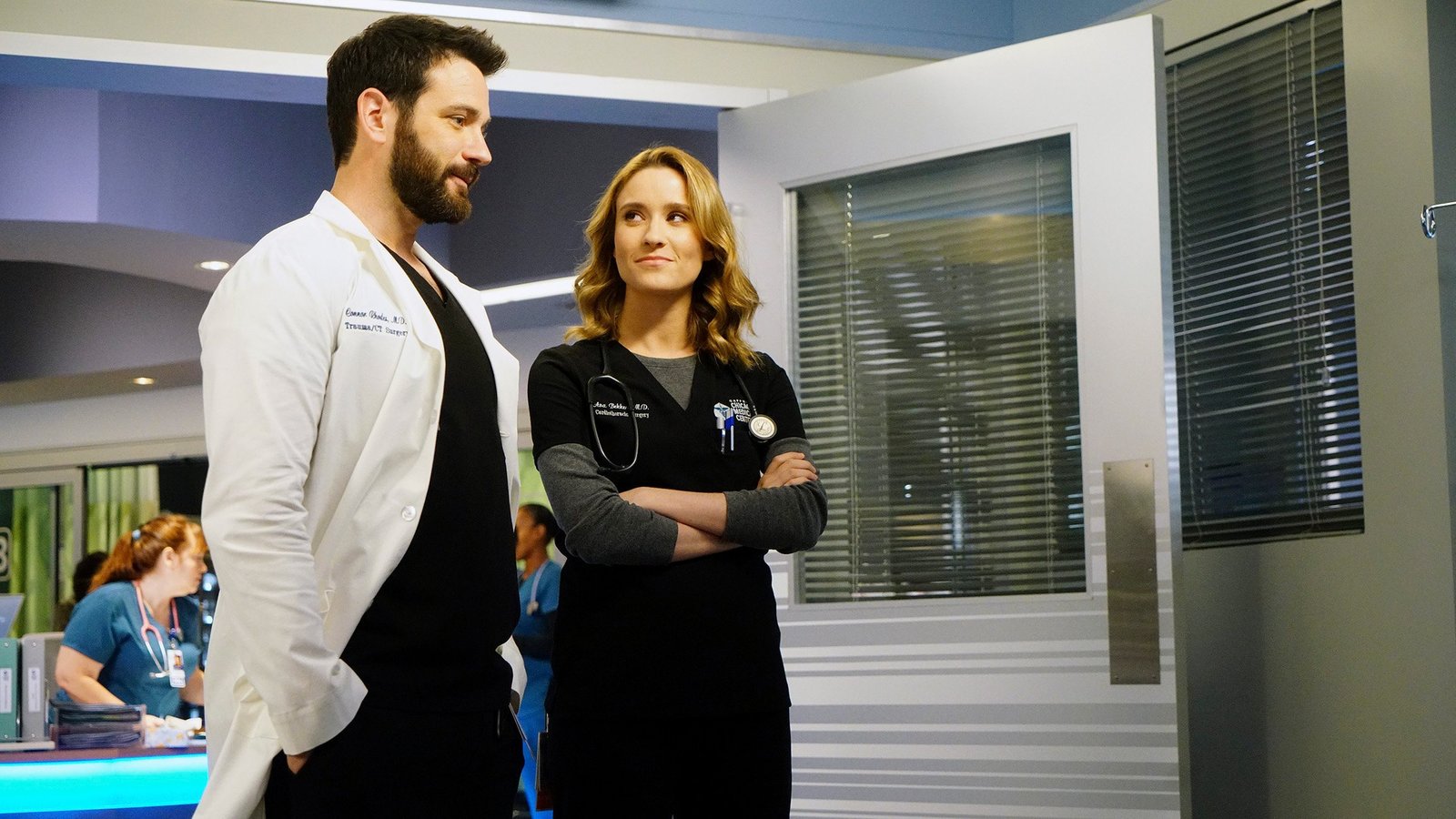 Mit dem Rücken zur WandChicago Med, Mit dem Rücken zur Wand Staffel 4 Folge 4 Sie gratuliert ihm: Colin Donnell als Dr. Connor Rhodes, Norma Kuhling als Ava Bekker. Copyright: SRF/NBC UniversalBild: © SRF/NBC Universal