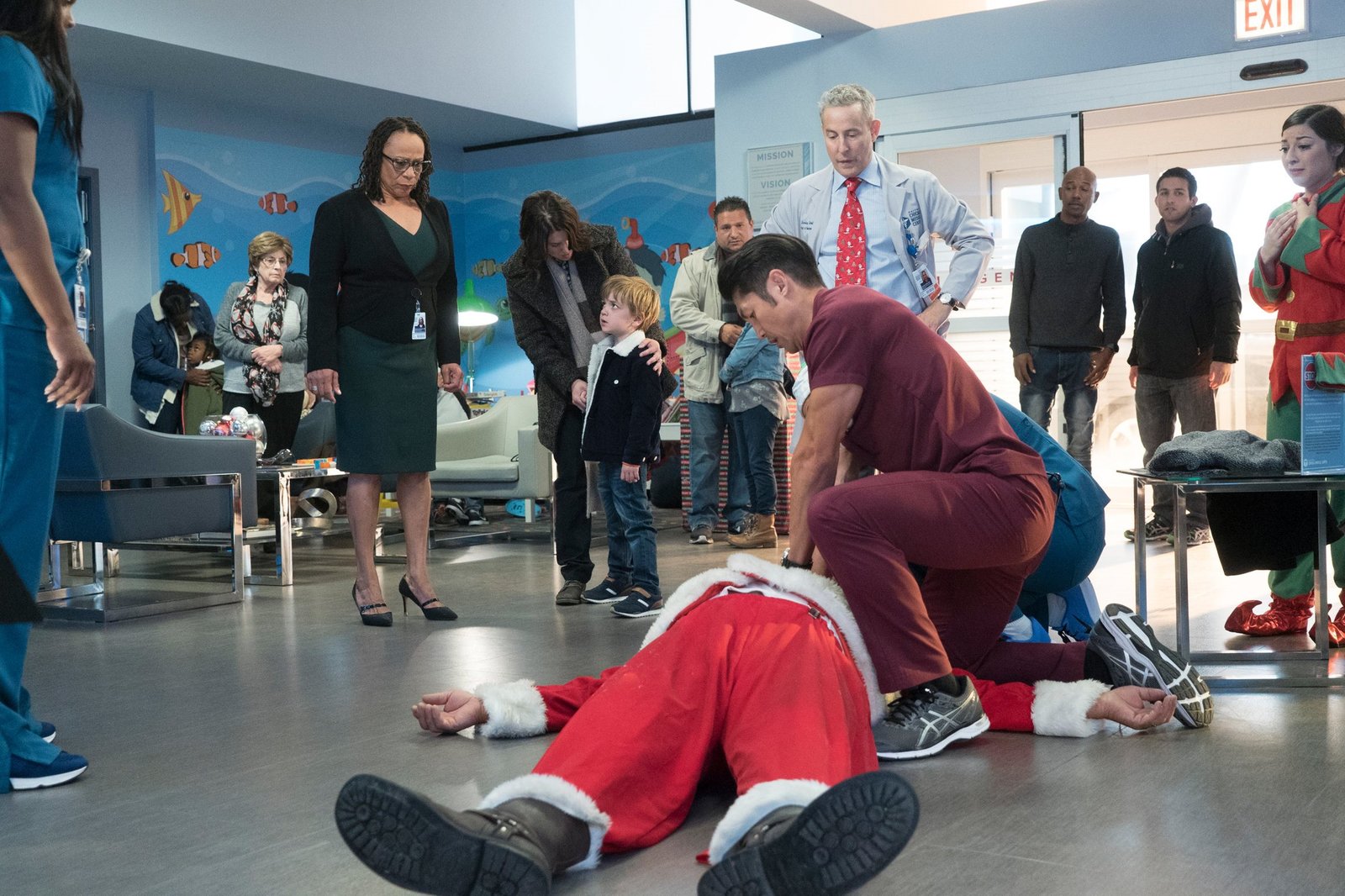 Hauen und StechenChicago Med Staffel 3 Folge 4 Er versucht einen Weihnachtsmann zu retten: S. Epatha Merkerson Sharon Goodwin, Brian Tee als Dr. Ethan Choi (knieend), Eddie Jemison als Stanley Stohl Copyright: SRF/NBC UniversalBild: © SRF/NBC Universal