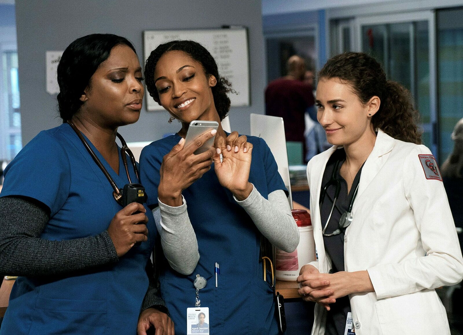 SchicksalsschlägeChicago Med Schicksalsschläge - Saints Staffel 1, Episode 7 Drei Kolleginnen amüsieren sich über Bilder auf dem Handy: Marlyne Barrett als Maggie Lockwood, Yaya DaCosta als April SextonBild: © SRF