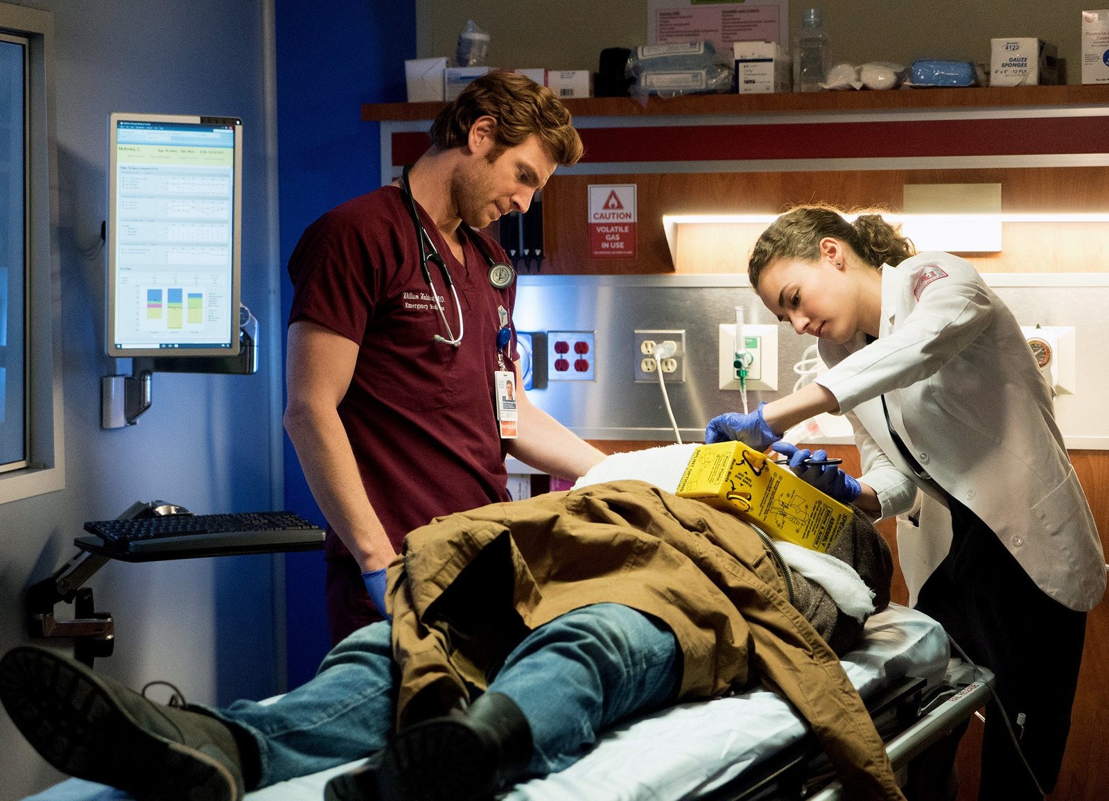 SchicksalsschlägeChicago Med Schicksalsschläge - Saints Staffel 1, Episode 7 Sie müssen notfallmässig eingreifen: Nick Gehlfuss als Dr. Will Halstead, Rachel DiPillo als Dr. Sarah ReeseBild: © SRF/NBC Universal