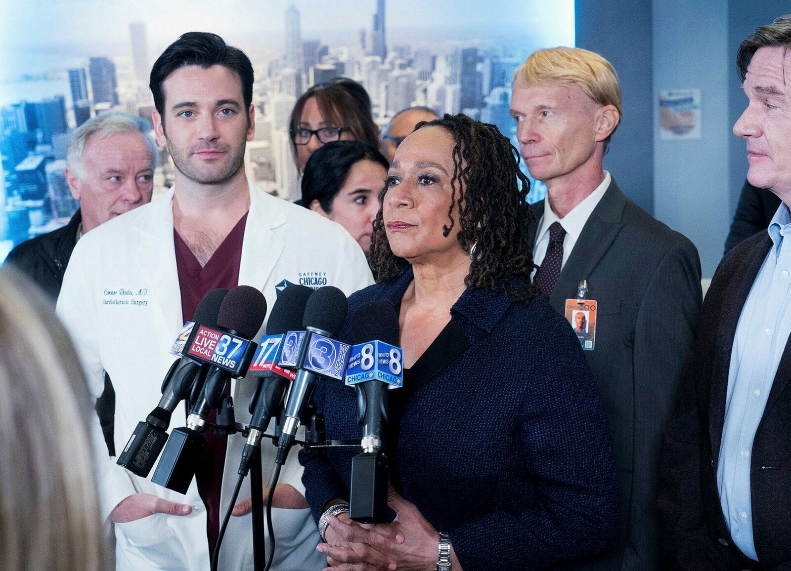 NachtschichtChicago Med Nachtschicht - Graveyard Shift Staffel 2, Episode 11 Sie verkünden die gut verlaufene OP vor den Medien: Colin Donnell als Dr. Connor Rhodes, S. Epatha Merkerson als Sharon GoodwinBild: © SRF