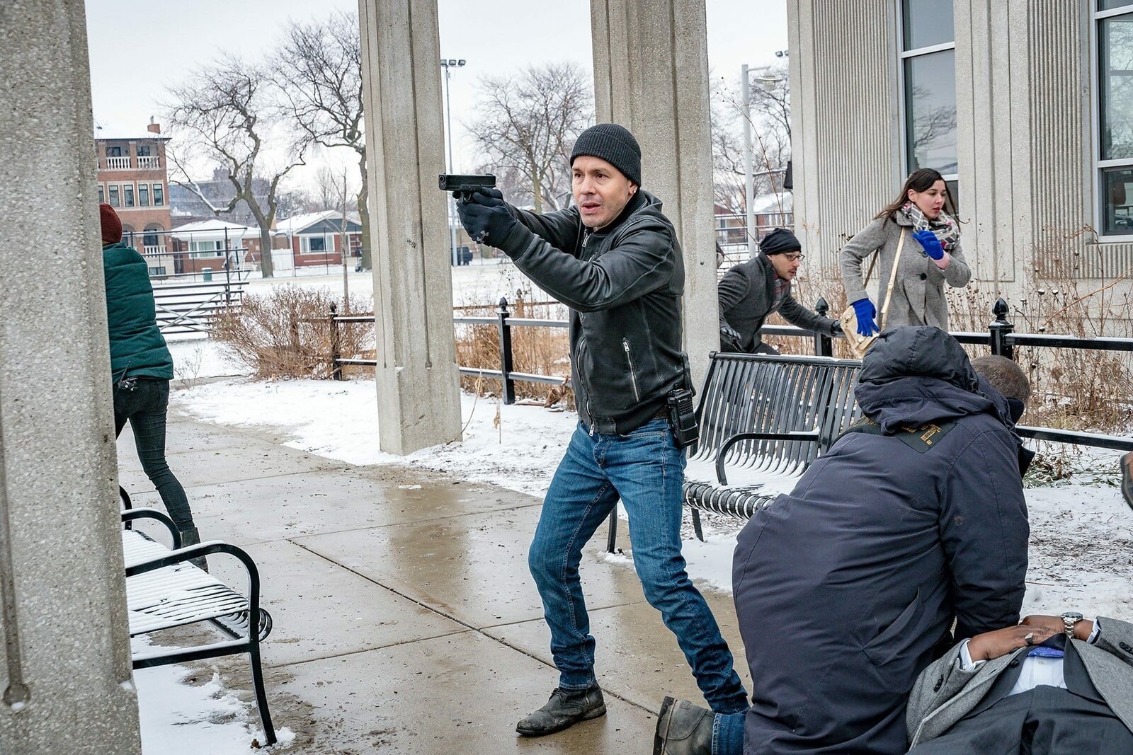Der FallenstellerSchusswechsel während einem Polizeieinsatz: Jesse Lee Soffer als Jay HalsteadBild: © SRF/2014 Universal Television LLC.