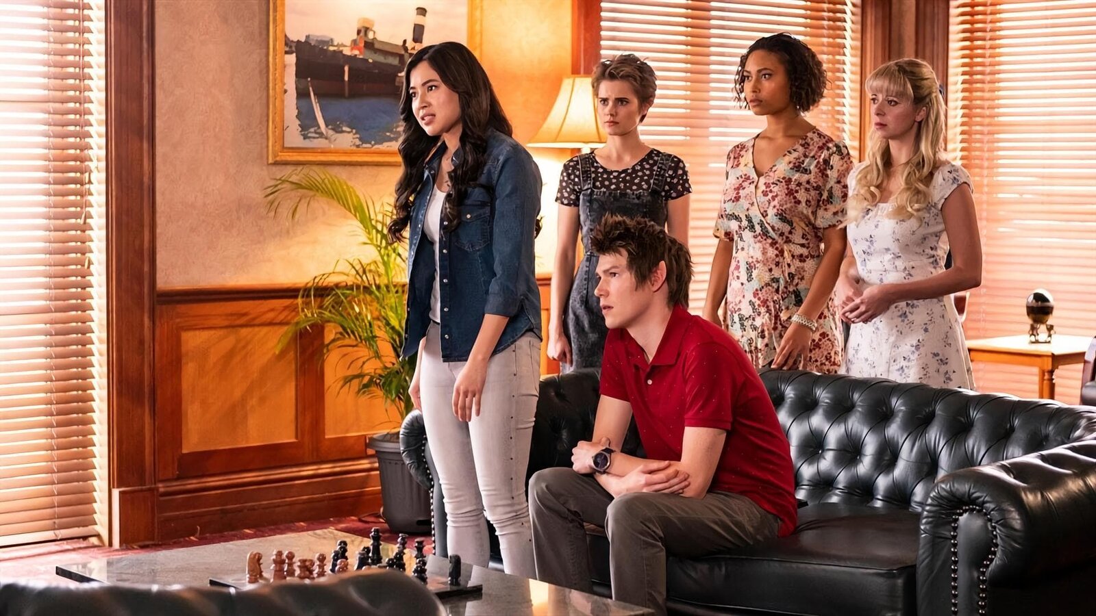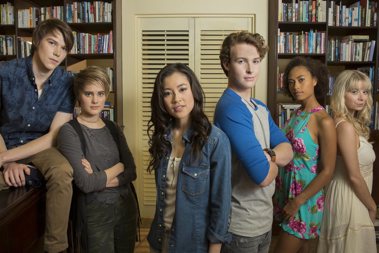Der Test(v.l.n.r.): Darra (Julian Cullen), Imogen (Elizabeth Cullen), Kyra (Kimie Tsukakoshi), Peter (Jamie Carter), Ruksy (Rainbow Wedell) und Lily (Mia Milnes) im Buchladen von Professor MaxwellBild: © ZDF und Tammy Law