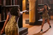 Der zweite SchlüsselZwei Taylas (Miah Madden) kämpfen mit ihren Zauberstäben gegeneinander. Die echte Tayla versucht, ihre böse Doppelgängerin wieder in den Zauberspiegel zurück zu verbannen. Doch die gibt so leicht nicht auf.Bild: © KiKA