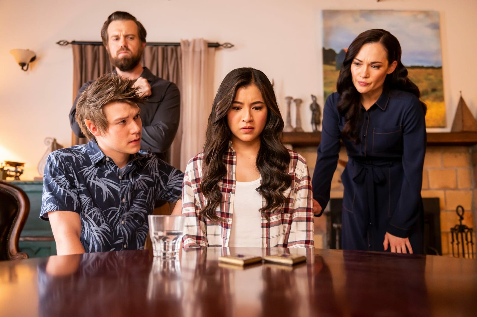 Magische WettkämpfeDarra (Julian Cullen, l.), Professor Maxwell (Christopher Sommers, 2.v.l.) und Apinya ( Tasneem Roc, r.) warten darauf, dass Kyra (Kimie Tsukakoshi, 2.v.r.) eine neue Vision vom "Tempel des purpurnen Lotus" hat. Sie hoffen, damit den Ort und die Bedeutung des Tempels herauszufinden.Bild: © KiKA