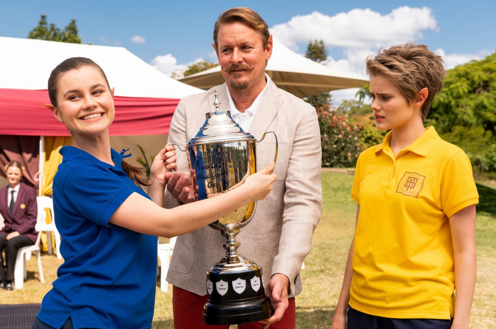 Magische WettkämpfeCamilla (Agnes Mohan, l.) nimmt stolz den Pokal aus den Händen von Jared (Paul Bishop, M.) für ihre Schulmannschaft entgegen. Nach einem Einspruch wurde ihnen nachträglich der Sieg zugesprochen. Imogen (Elizabeth Cullen, r.) ist sauer, denn eigentlich hätte ihre Schule den Pokal verdient.Bild: © ZDF und (c) 2020 Jonathan M. Shiff Productions
