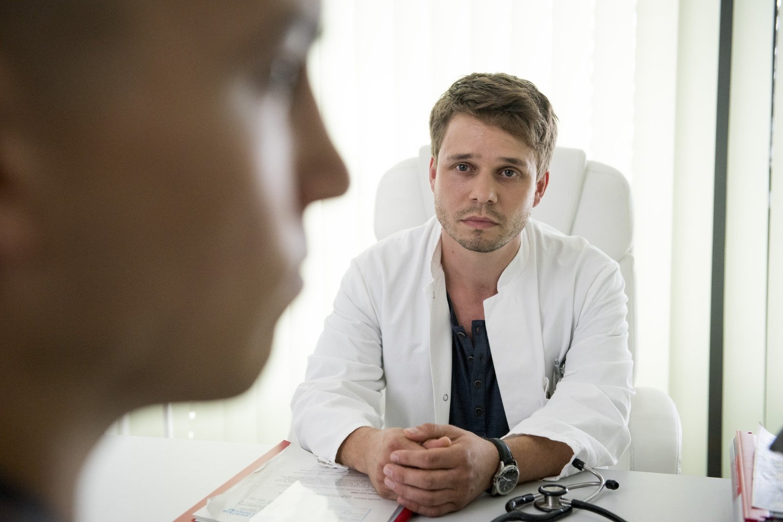 SchockLeo (Tim Oliver Schultz, l.) hat einen Termin bei Dr. Hein (Jonas Baeck).Bild: © RTL Passion