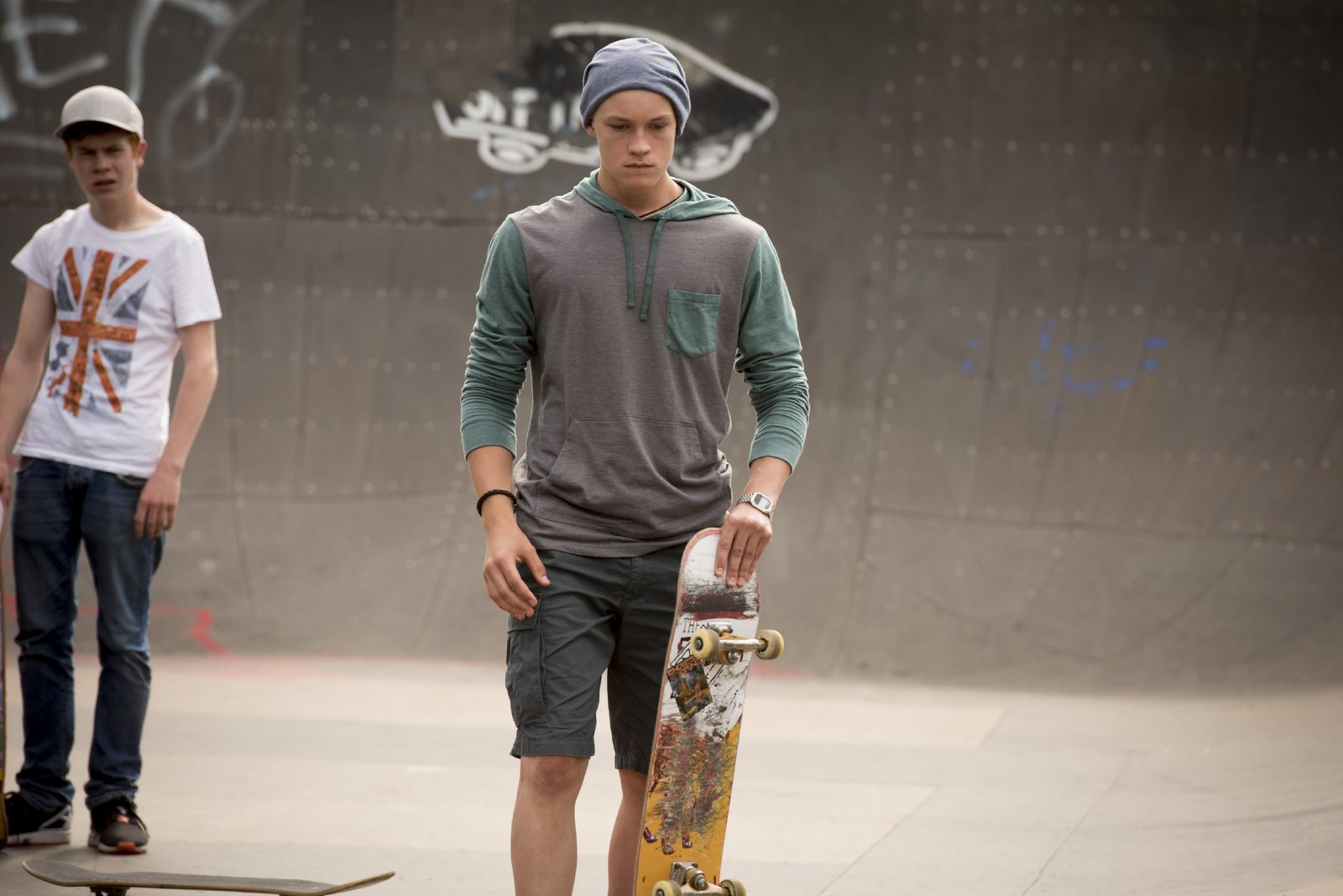Das SchwimmbadAusgelassen skatet Jonas Till Neumann (Damian Hardung) mit seinen Freunden. Doch am nächsten Tag steht eine große Operation für ihn an.Bild: © RTL Passion / Martin Rotte
