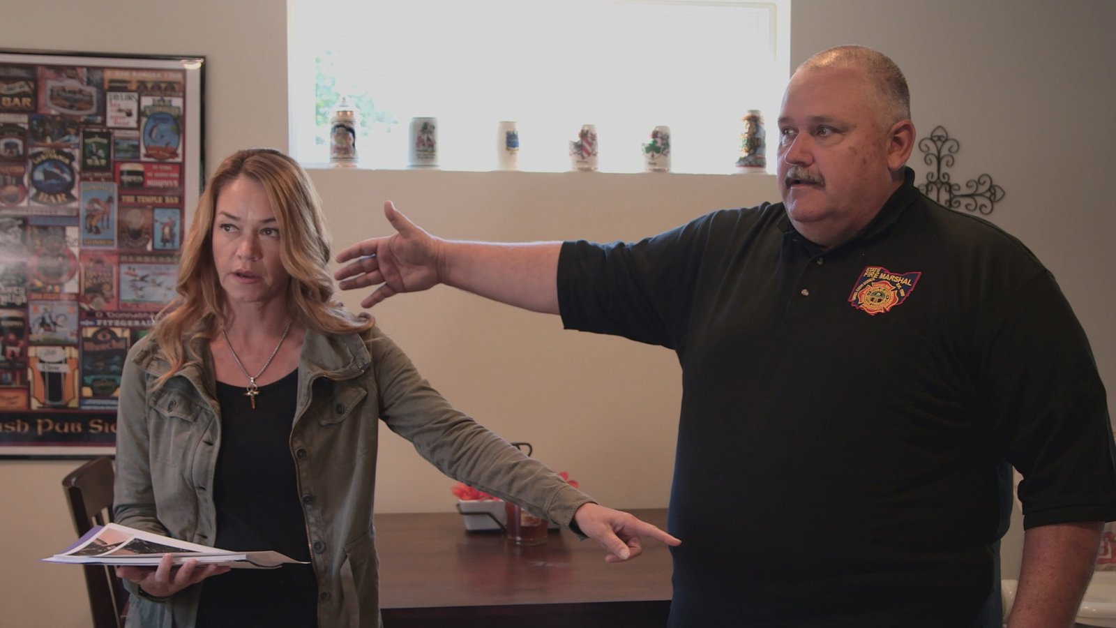 Vergrabene BeweiseBallistikexperte Matt Noedel (r.) demonstriert einen möglichen Selbstmordszenario für Kelly Siegler (l.) und die Ermittler.Bild: © SUPER RTL