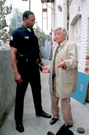 Die letzte Party"Columbo - Die letzte Party", Mafioso Tony stürzt während eines Streits mit seiner Ex-Frau Vanessa so unglücklich, dass er an den Folgen des Unfalls stirbt. Event-Manager Justin, der auf eine Überweisung Tonys wartet, fürchtet um sein Geld. Bis der Betrag auf seinem Konto eingelangt ist, will er gemeinsam mit Vanessa die Leiche verstecken. Dabei werden sie von einem Reporter beobachtet und erpresst. Justin räumt den Zeugen aus dem Weg. Columbo übernimmt die Ermittlungen und kommt Justin schon bald auf die Schliche.Im Bild (v.li.): Julius Carry (Polizist), Peter Falk (Inspektor Columbo).Bild: © ZDFneo