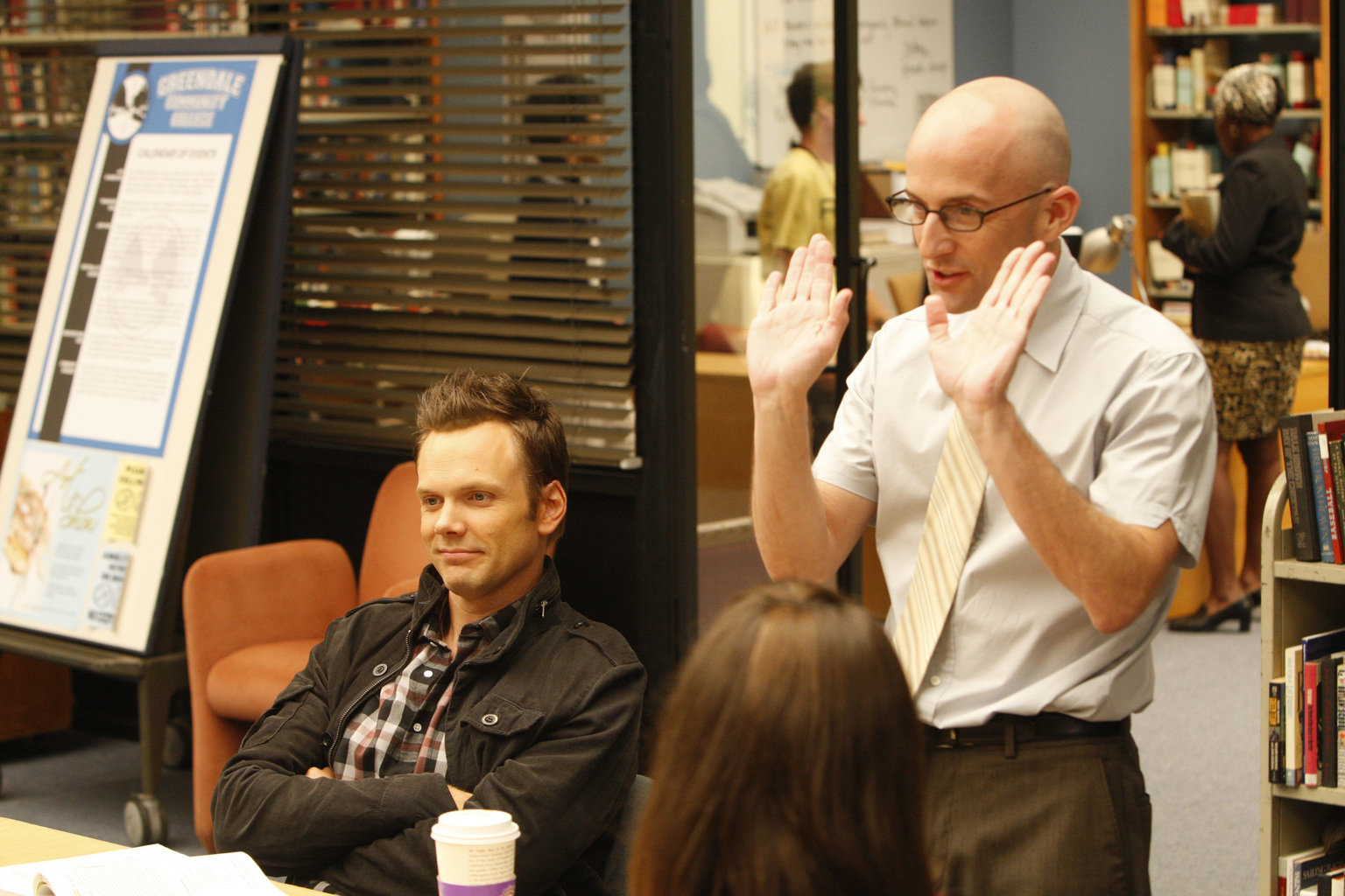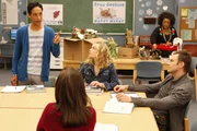 Das P-WortSenor Chang (Ken Jeong, M.) lässt sich nicht gefallen, dass Jeff (Joel McHale, vorne M.) seine Unterrichtstunde für ein Nickerchen nutzt ...Bild: © CPT Holdings, Inc. All Rights Reserved. Lizenzbild frei