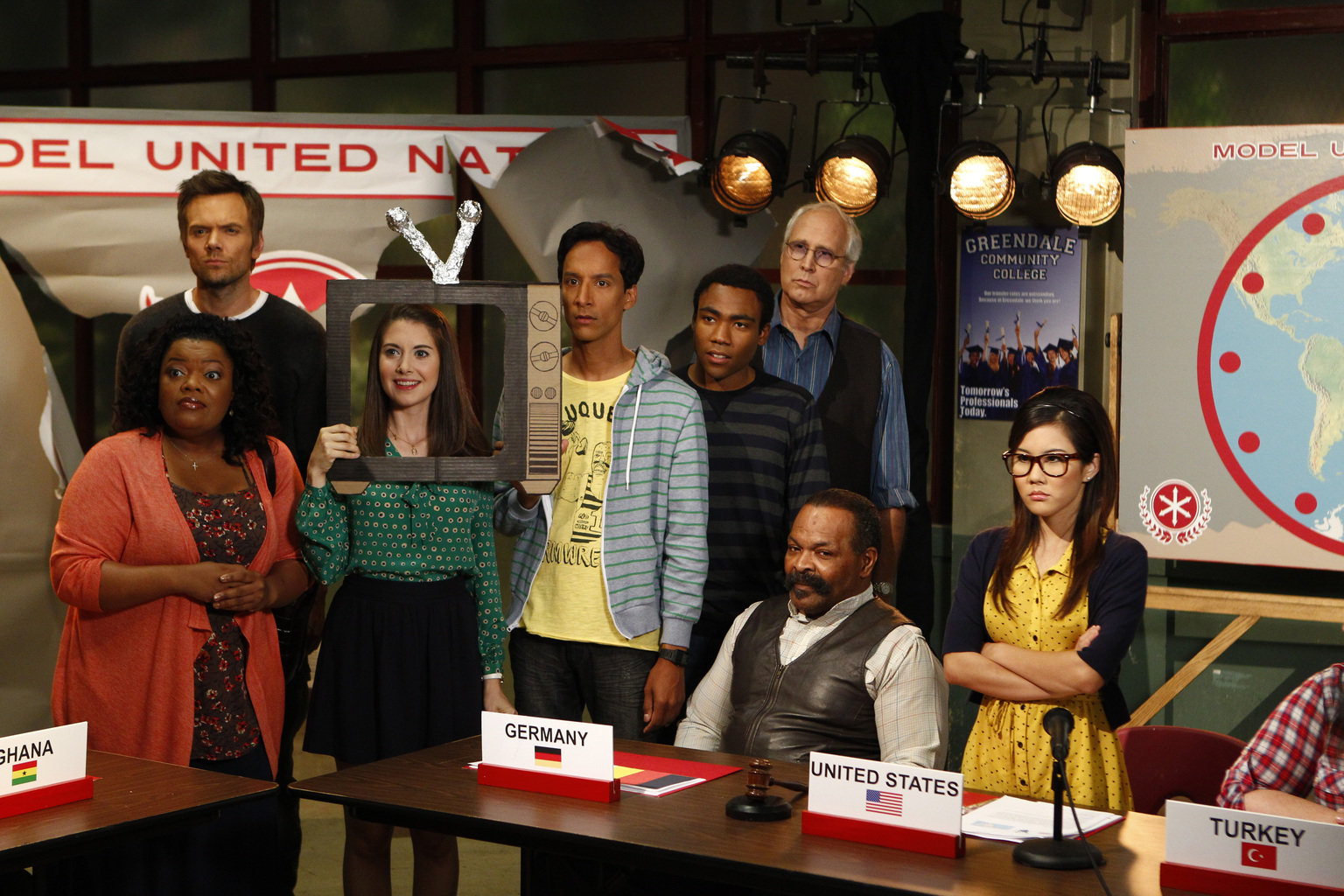 Verfurzte NationenAnnies (Alison Brie, 3.v.l.) asiatische Doppelgängerin Annie Kim (Irene Choi, r.) hat ihre Idee zu einer Planspiel-UN geklaut, aber zum Glück steht die Studiengruppe geschlossen hinter ihr ...Bild: © Sony Pictures Television Inc. All Rights Reserved. Lizenzbild frei