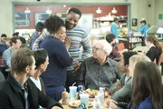 Ein Zylinder voller Super-SpermaEin Stuhl bleibt von nun an leer: Annie (Alison Brie, l.), Jeff (Joel McHale, 2.v.l.), Shirley (Yvette Nicole Brown, 3.v.l.), Britta (Gillian Jacobs, 4.v.r.), Troy (Donald Glover, 3.v.r.), Abed (Danny Pudi, 2.v.r.) und Chang (Ken Jeong, r.) trauern um den verstorbenen Pierce ...Bild: © ProSieben Fun