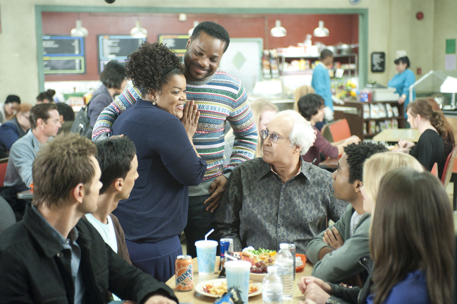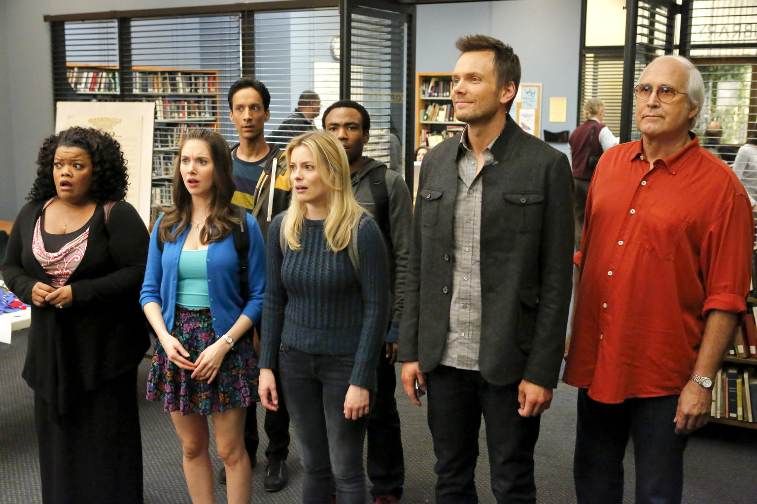 Freaky FridayEin völlig verrückter Freitag: Shirley (Yvette Nicole Brown, l.), Annie (Alison Brie, 2.v.l.), Britta (Gillian Jacobs, 3.v.l.), Jeff (Joel McHale, 2.v.r.), Pierce (Chevy Chase, r.), Abed (Danny Pudi, l. hinten) und Troy (Donald Glover, r. hinten) erleben merkwürdige Dinge in Greendale ...Bild: © ProSieben Fun
