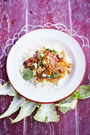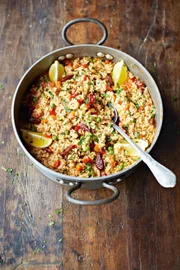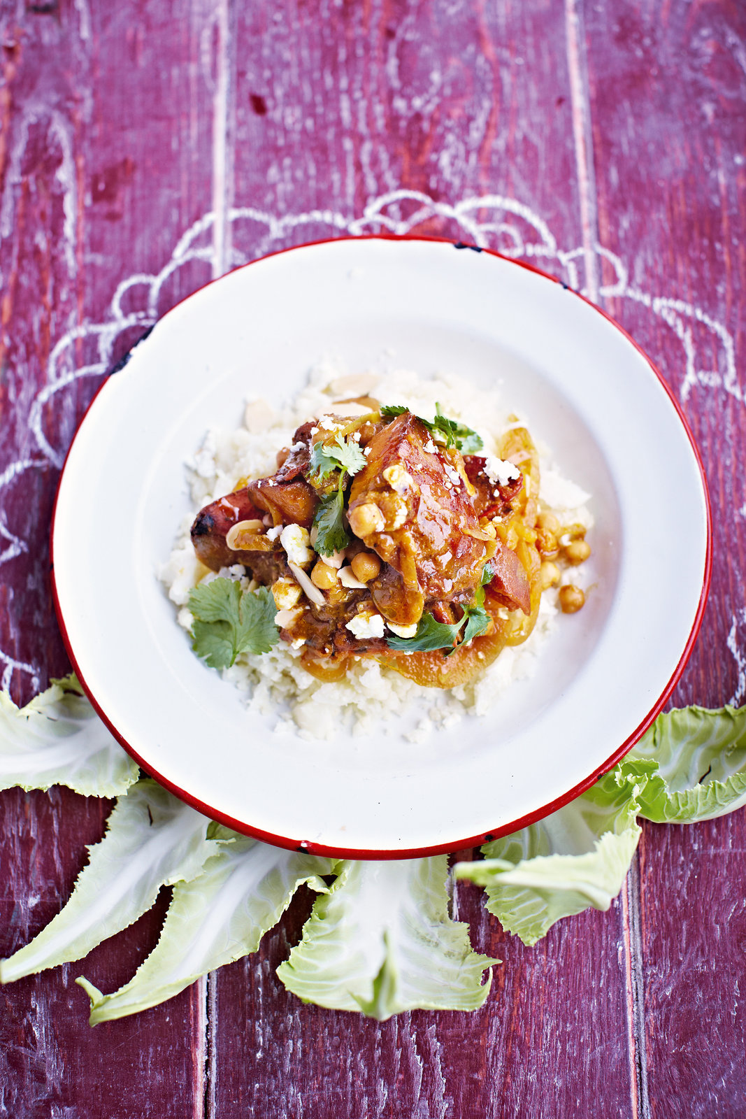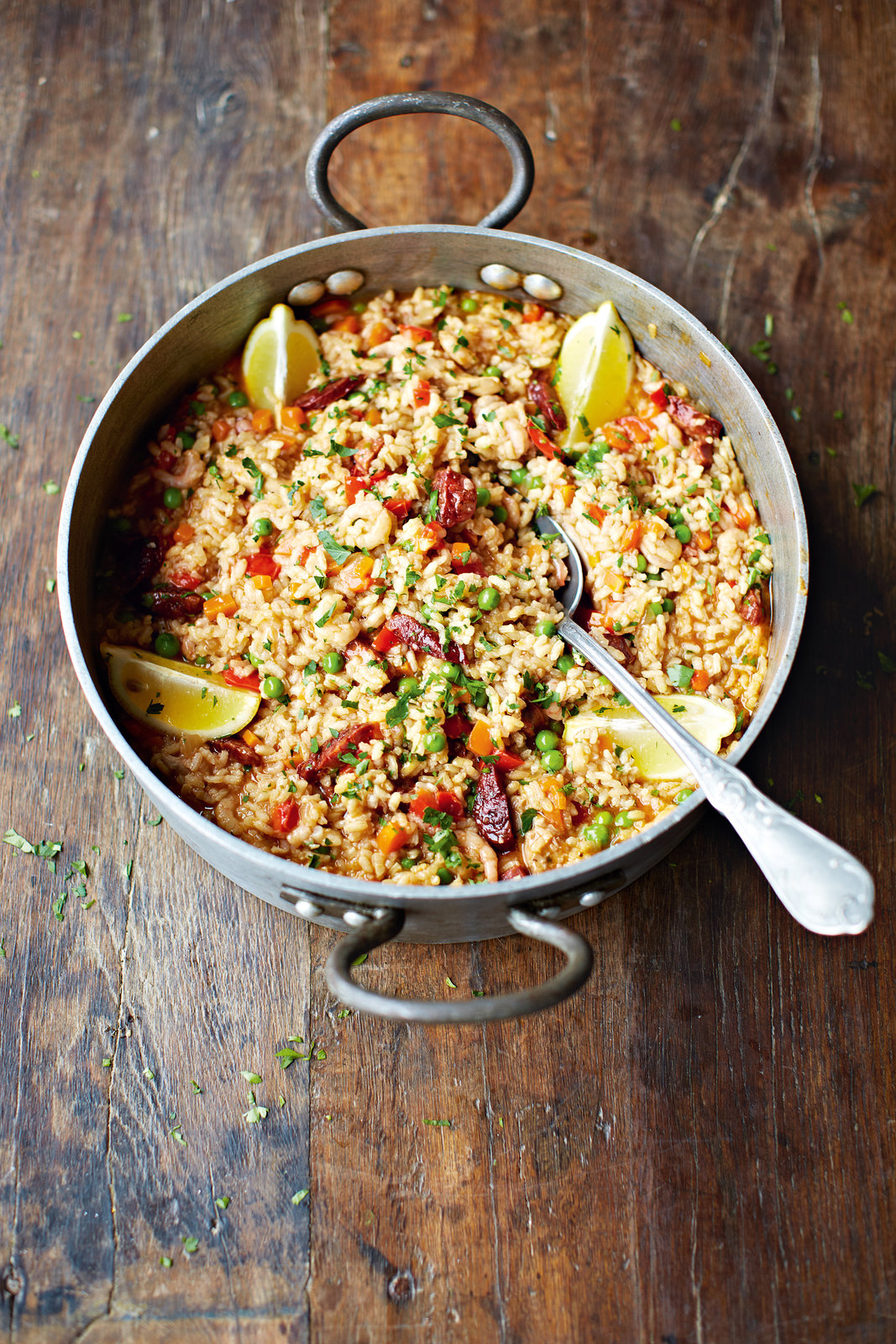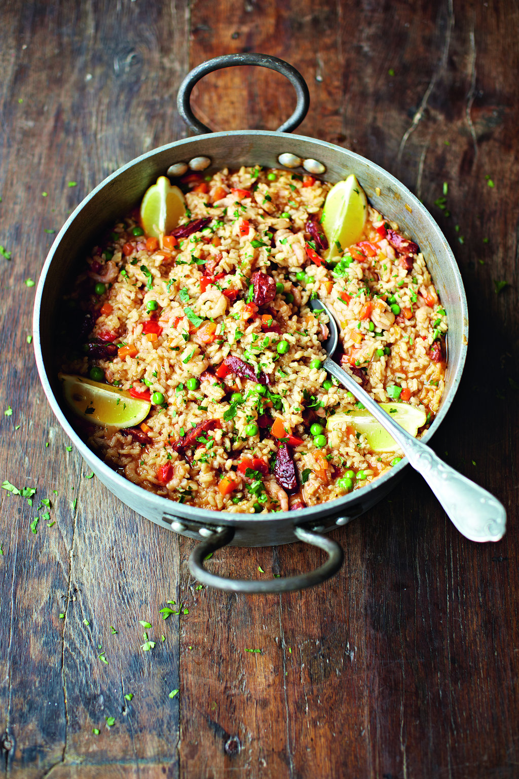 Saftige Paella und wohlschmeckende KräuterDiese Paella hat es in sich: Hähnchenschenkel, Chorizo, eine würzige spanische Wurst, und Garnelen ...Bild: © 2013 Jamie Oliver Enterprises Ltd. Lizenzbild frei