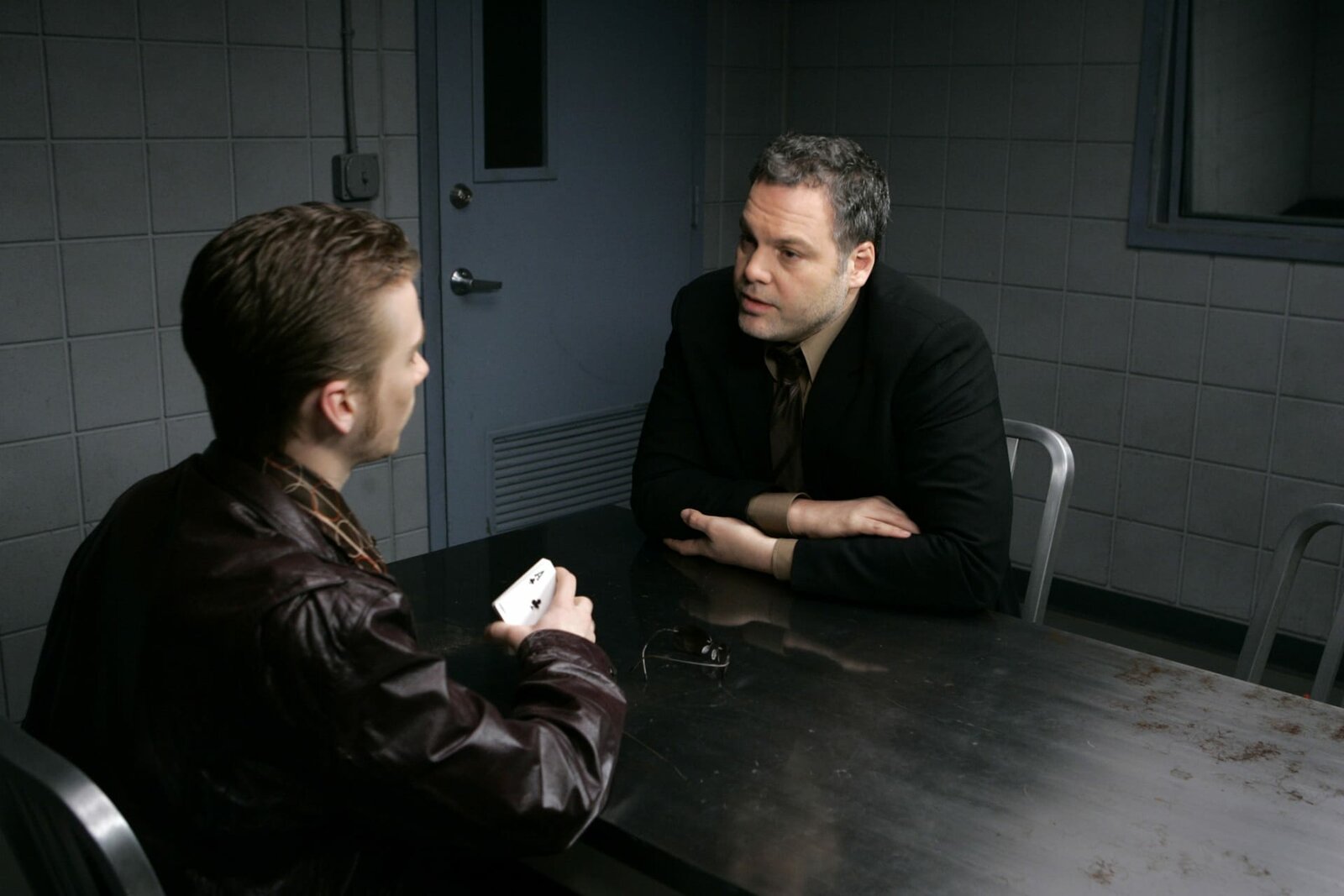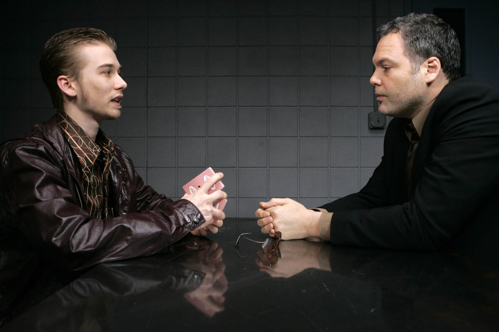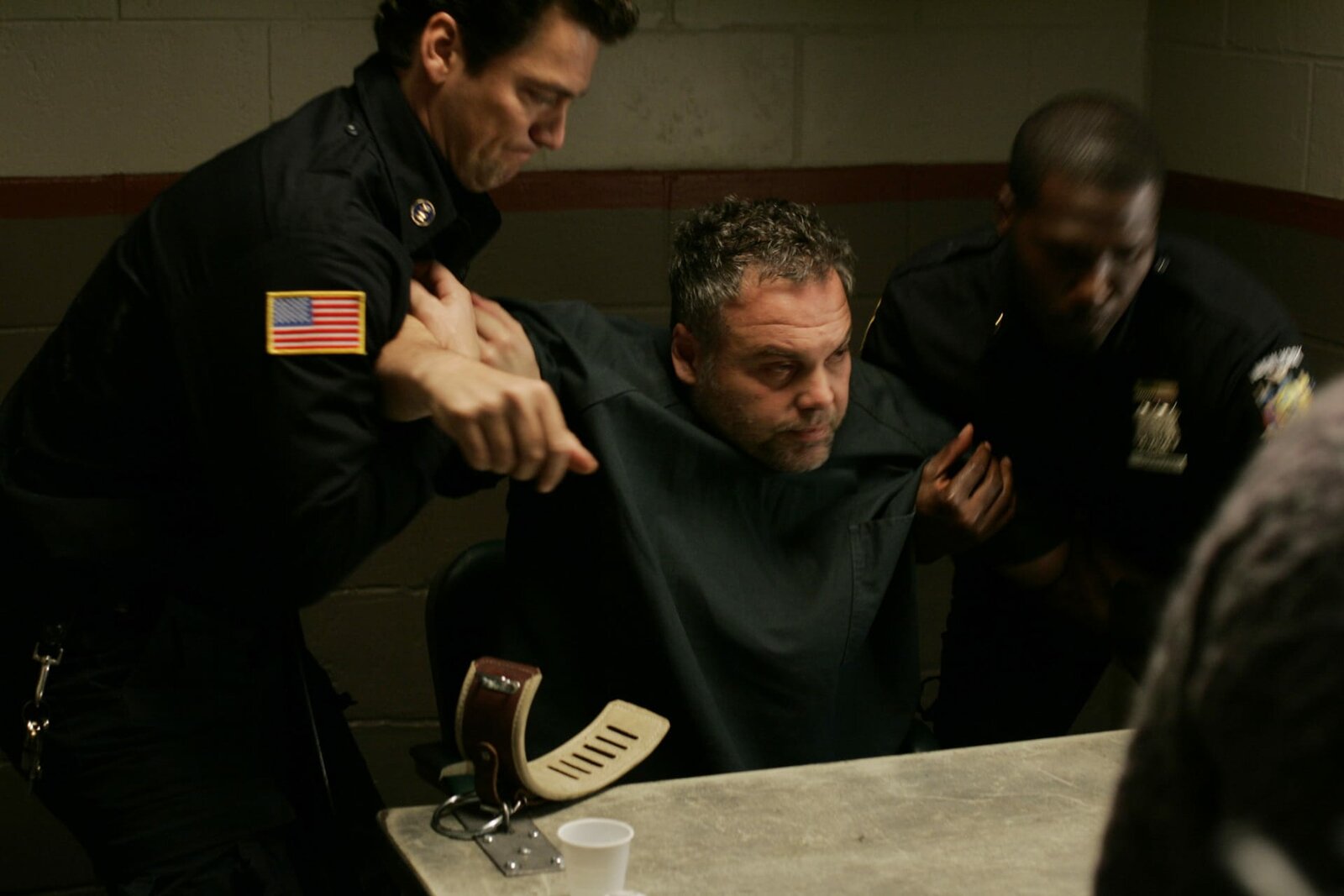 Im Namen des HerrnDetekctive Goren (Vincent D\'Onofrio, l.) überführt Dennis (Robert Stanton) des Mordes.Bild: © VOX