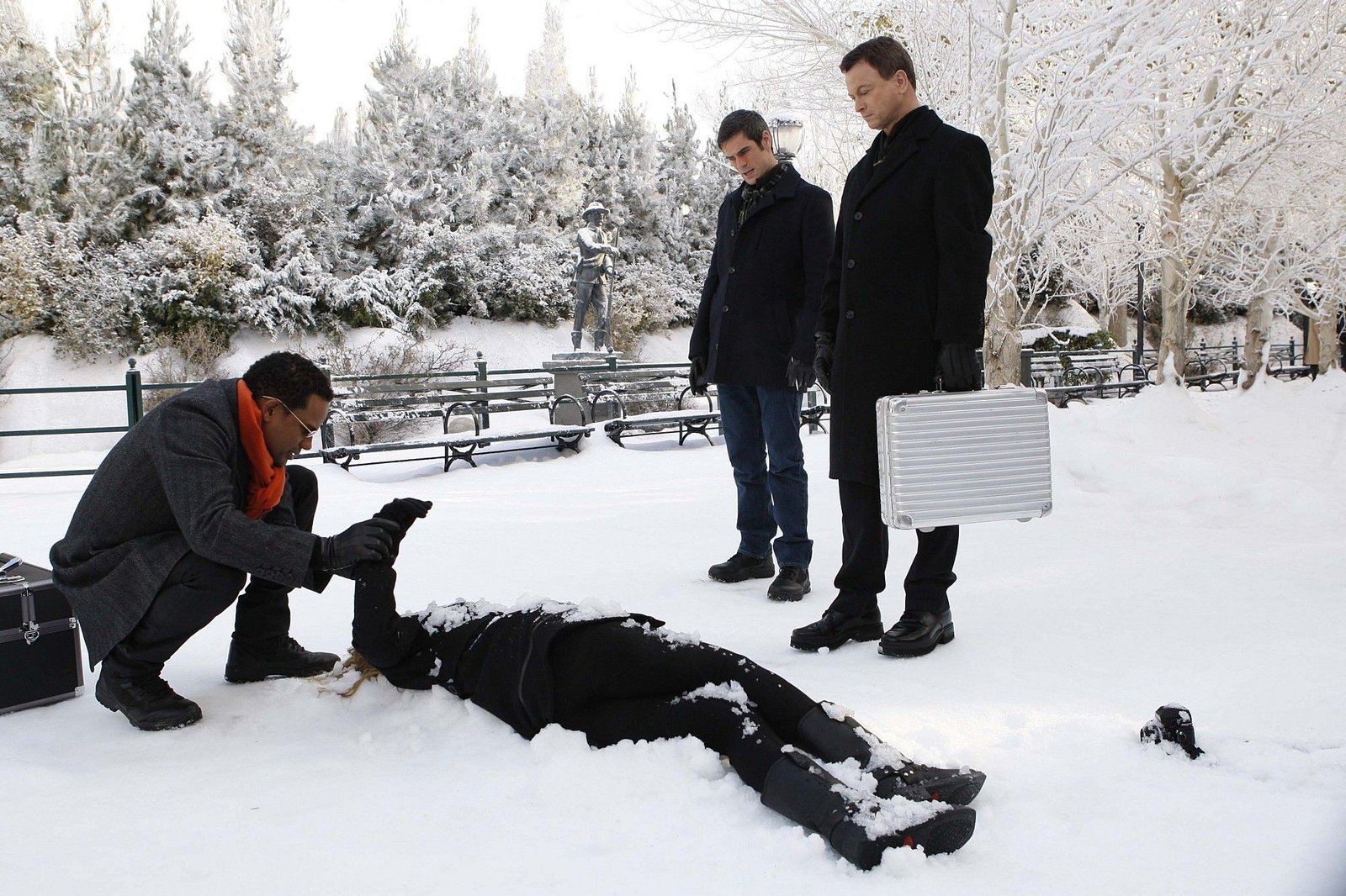 BlutsaugerBei den ersten Untersuchungen des Tatorts fällt Det. Sheldon Hawkes (Hill Harper, l.), Det. Don Flack (Eddie Cahill) und Det. Mac Taylor (Gary Sinise, r.) sofort eine mysteriöse, kreuzförmige Narbe am Handgelenk des Opfers Estelle Christensen (Melinda Dahl) auf. Hat das etwa eine Bedeutung?Bild: © RTL NITRO / CBS