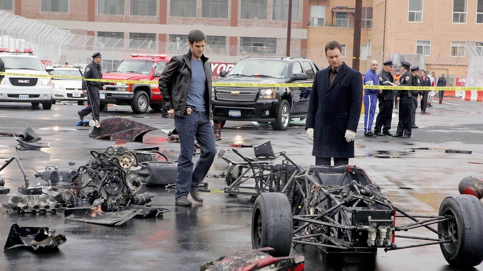 BoxenstoppDie Detectives Don Flack (Eddie Cahill, l.) und Mac Taylor (Gary Sinise) untersuchen die Überreste eines explodierten Rennwagens. War es ein Unfall oder Sabotage?Bild: © MG RTL D / CBS