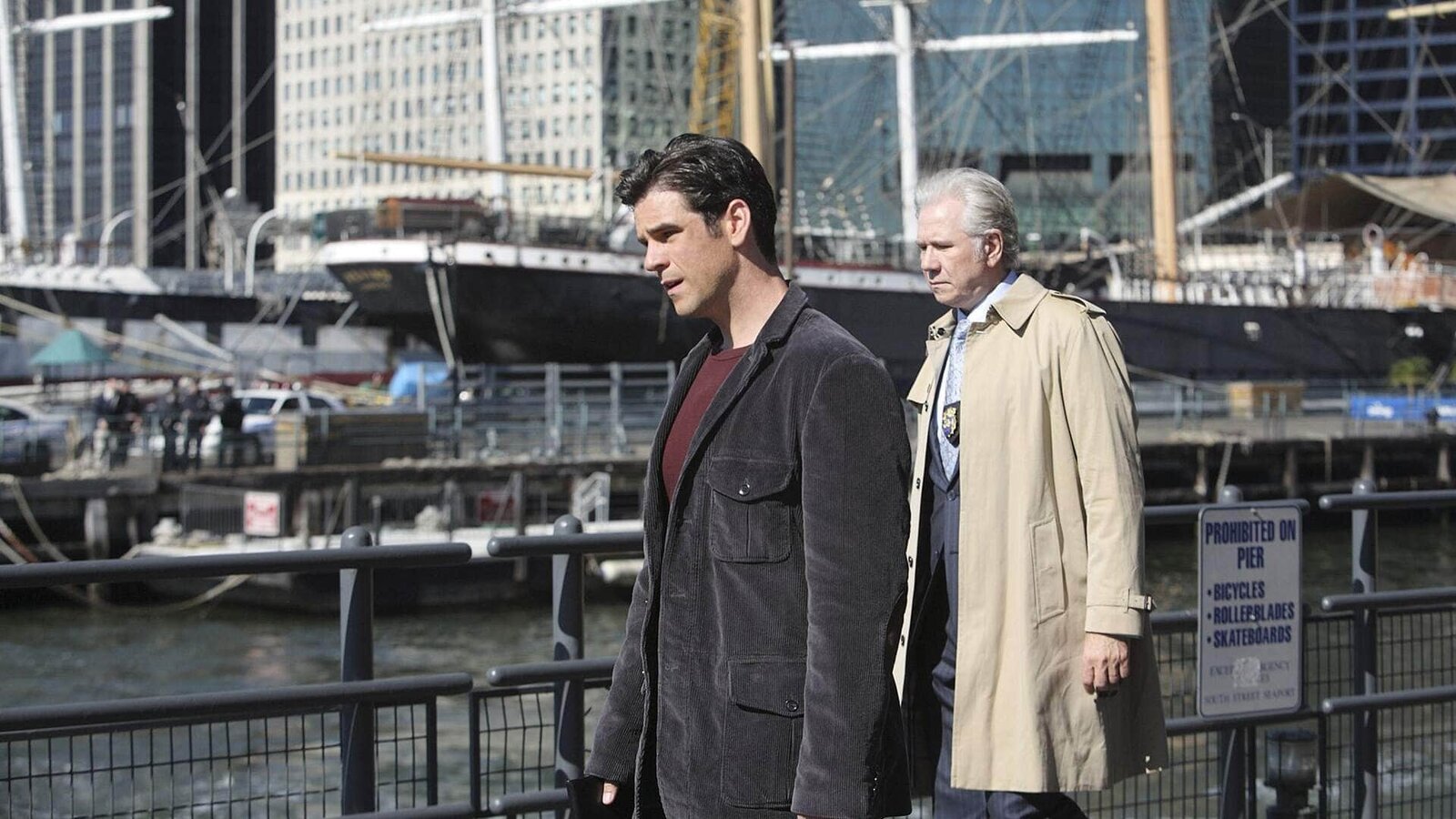 Mantel des SchweigensDet. Don Flack (Eddie Cahill, l.) führt Chief Ted Carver (John Larroquette) zum Hudson River. Die Leiche einer Frau, die schwer misshandelt und erschossen wurde, wurde dort geborgen.Bild: © TVNOW / CBS Die Verwendung des RTL Crime-Bildmaterials ist nur zur redaktionellen Berichterstattung im Zusammenhang mit der jeweiligen Sendung unter Angabe der Credits/Quellenangabe und Beachtung der