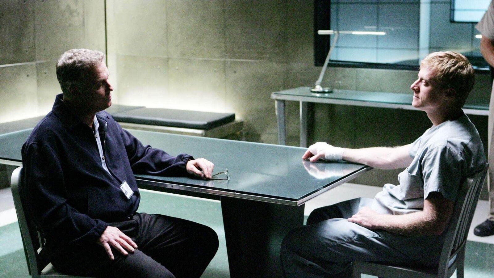 Verhalten ohne VernunftAls zwei Jungen vermisst werden, muss sich der für seine pädophilen Neigungen bekannte Carl Fisher (Alan Tudyk, re.) den Fragen des CSI-Ermittlers Gil Grissom (William Petersen) stellen.Bild: © TVNOW / CBS
