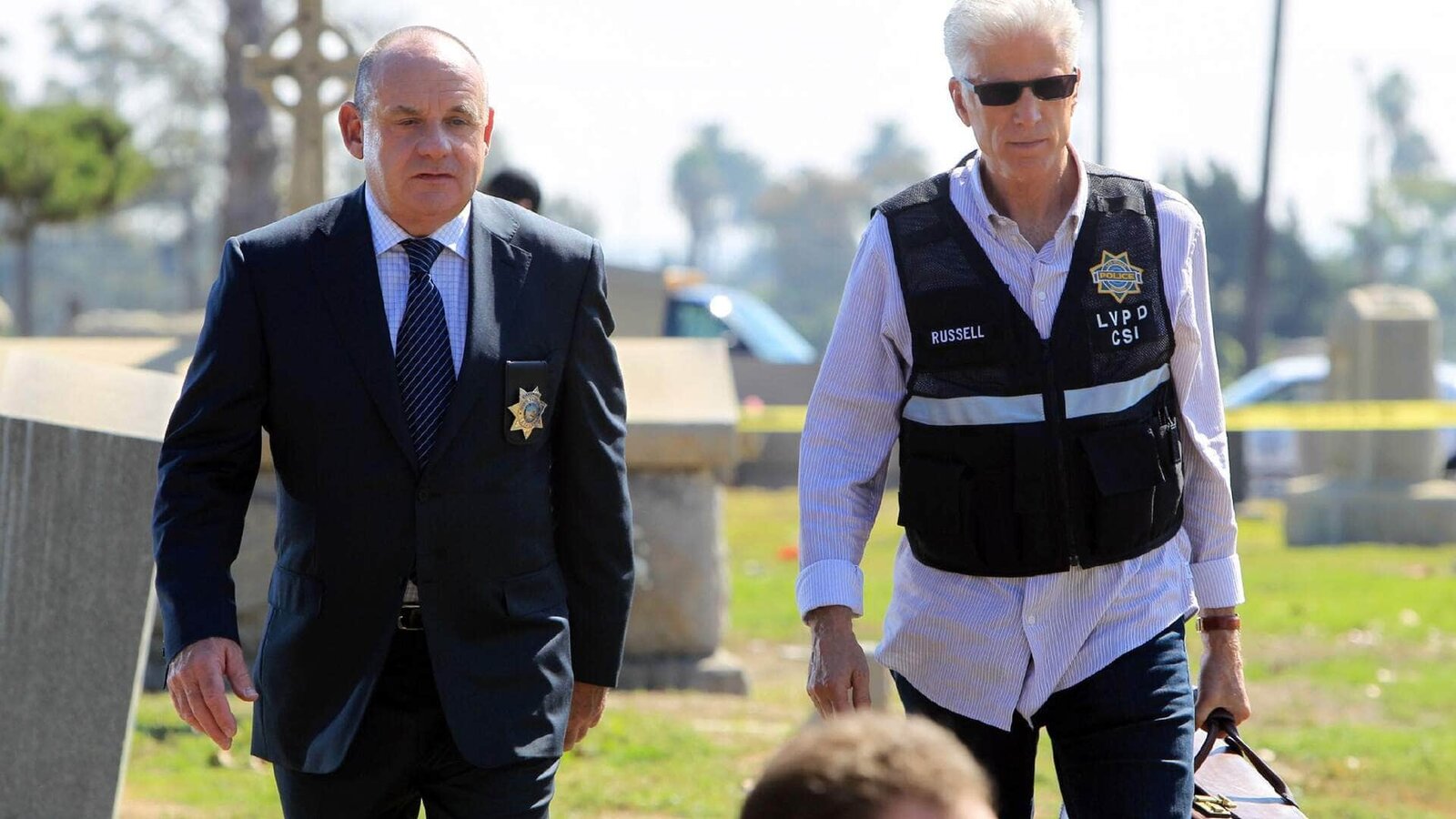 Warricks FamilieCaptain Jim Brass (Paul Guilfoyle, l.) und D. B. Russell (Ted Danson) werden zu der letzten Ruhestätte ihres ehemaligen Mitarbeiters Warrick Brown gerufen, auf dessen Grab der Reverend Rick Renken erschossen aufgefunden wird.Bild: © MG RTL D