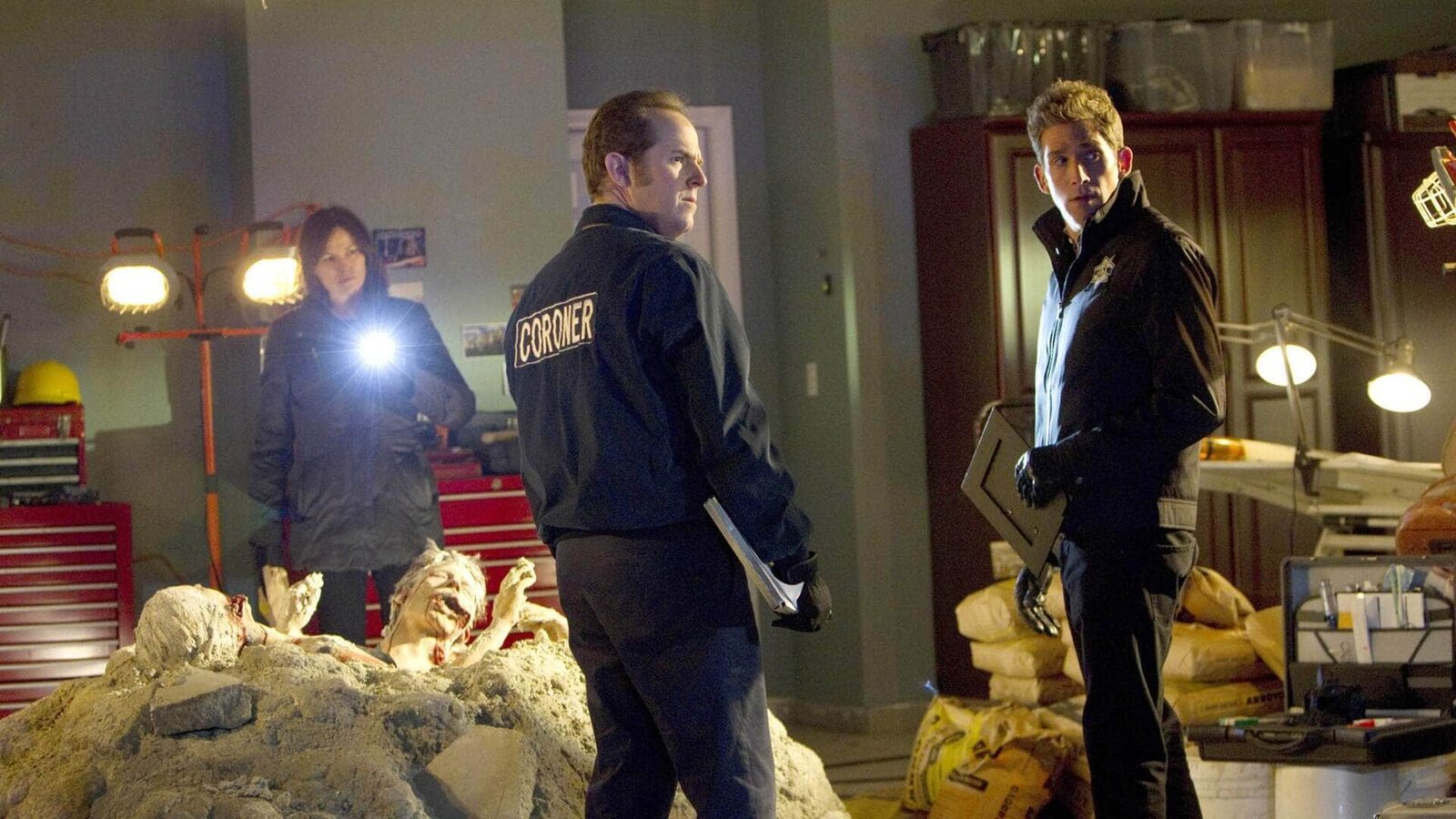 De Los MuertosSara (Jorja Fox), Greg (Eric Szmanda, r.) und Gerichtsmediziner David Phillips (David Berman) suchen nach Hinweisen auf die Identität von zwei Leichen, die in Beton eingebettet tot in einer Garage gefunden wurden.Bild: © MG RTL D