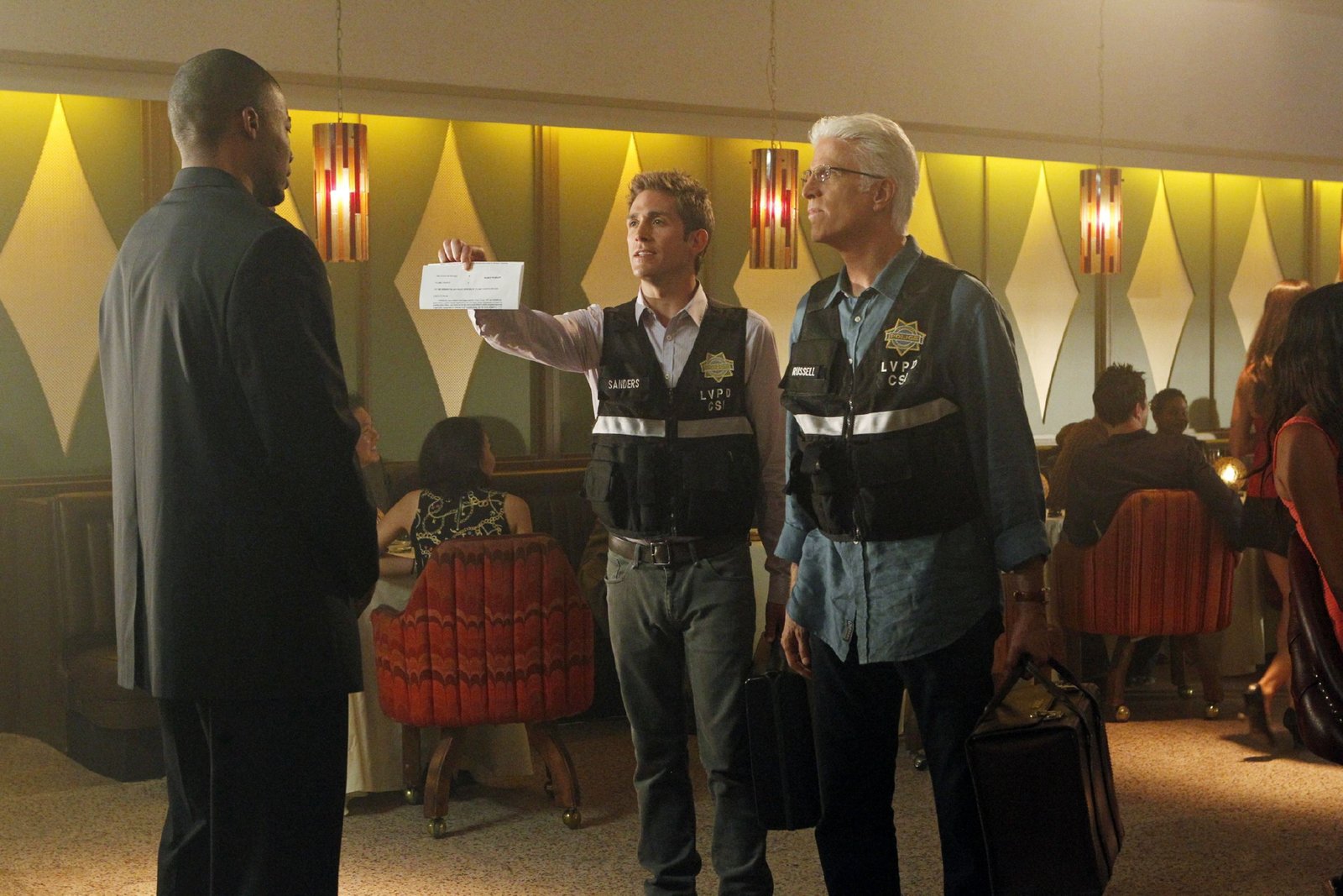 Am Ende bleibt nur SinatraGreg Sanders (Eric Szmanda, M.) und D.B. Russell (Ted Danson, r.) verhören den Stage Manager (Marcus Brown) der 'Rat Pack'-Nostalgie-Show.Bild: © RTL