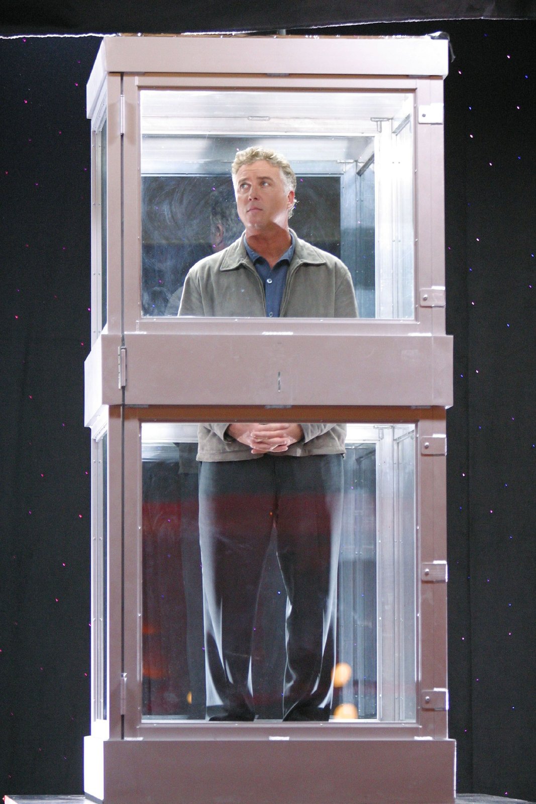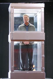 Fauler ZauberGil Grissom (William Petersen) versucht herauszufinden, wie der Glaskasten, aus dem der Magier verschwinden wollte, in Brand geraten konnte.Bild: © RTL / CBS