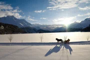 Engadin, da will ich hin!ENGADIN ST. MORITZ - Pferdekutsche in der verschneiten Silser Landschaft in der Abendsonne. Blick Richtung BergellBild: © SR/Swiss Image Library