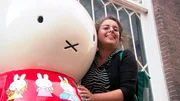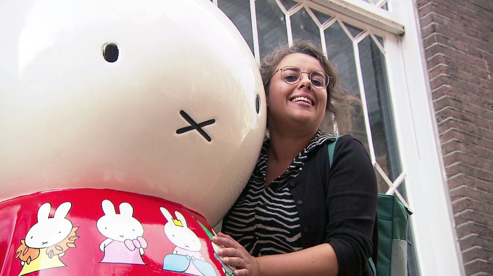 Utrecht, da will ich hin!Moderatorin Simin Sadeghi mit Miffy. Die Figur kennt in den Niederlanden jedes Kind. Dort heißt sie allerdings Nijntje. Erschaffen hat sie der Utrecher Autor und Zeichner Dick Bruna.Bild: © SR/Barbara Hafner