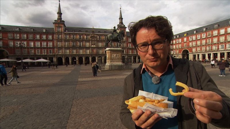 Madrid, da will ich hin!Moderator Michael Friemel probiert auf der Plaza Mayor eine madrilenische Spezialität: Bocadillo con Calamares, Brötchen mit Tintenfinschringen.Bild: © ZDF und SR