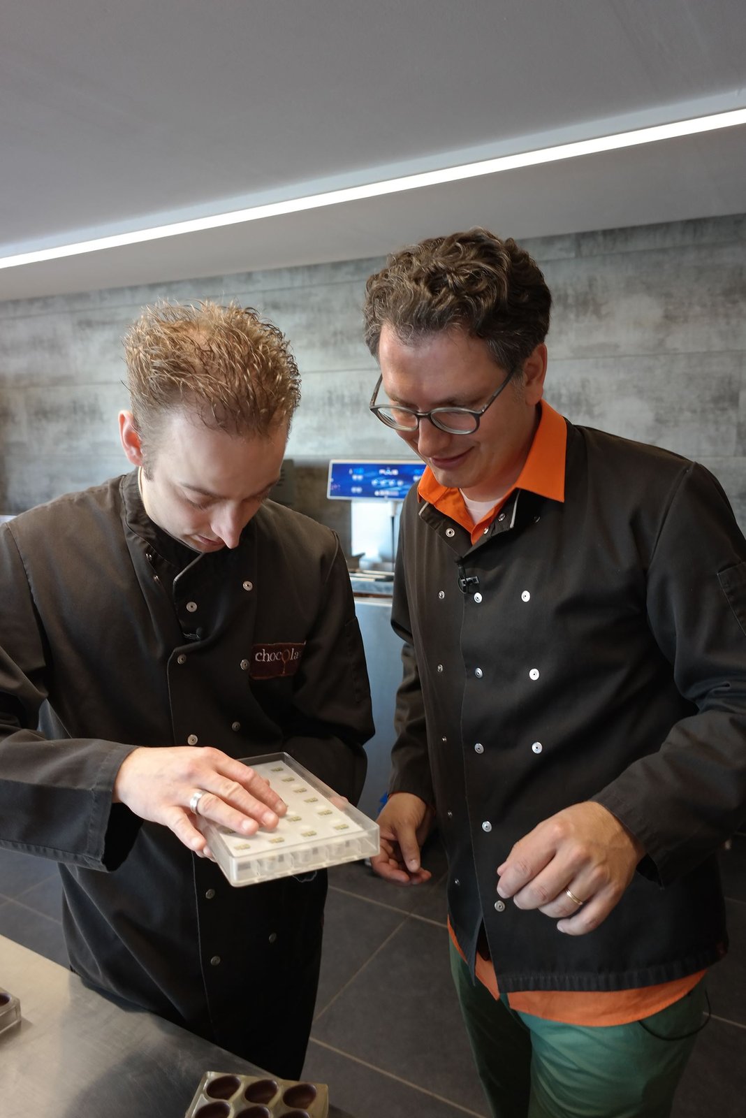 Gent, da will ich hin!Selbstgemachte Pralinen Michael Friemel (r.) zusammen mit dem Genter Cholatier Dimitry Blocken.Bild: © SR/Martin Schindel