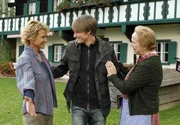 Für immer daheimTheres (Enzi Fuchs, re.) und Maren (Uschi Glas) begrüßen deren Sohn Michael (Axel Schreiber).Bild: © ZDF und ARD Degeto/Hans Seidenabel