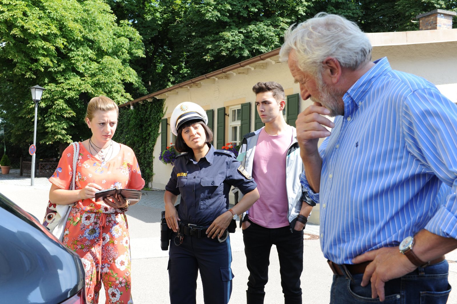 Jetzt ist es raus!Sarah kombiniert sofort, wer das Transparent mit dem Liebesspruch aufgehängt und dabei offenbar Martins Auto beschädigt hat. Von links: Sarah Brandl (Sophie Reiml), Josephine Drechsler (Mira Mazumdar), Felix Brunner (Shayan Hartmann) und Martin Kirchleitner (Hermann Giefer).Bild: © BR/Marco Orlando Pichler
