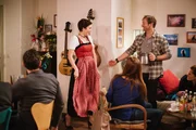FleischeslustGregor freut sich, dass Fanny das neue Dirndl gefällt. Von links: Mike Preissinger (Harry Blank), Fanny Lechner (Katrin Lux), Trixi Preissinger (Doreen Dietel), Gregor Brunner (Holger M. Wilhelm) und Annalena Brunner (Heidrun Gärtner).Bild: © BR/Nadya Jakobs