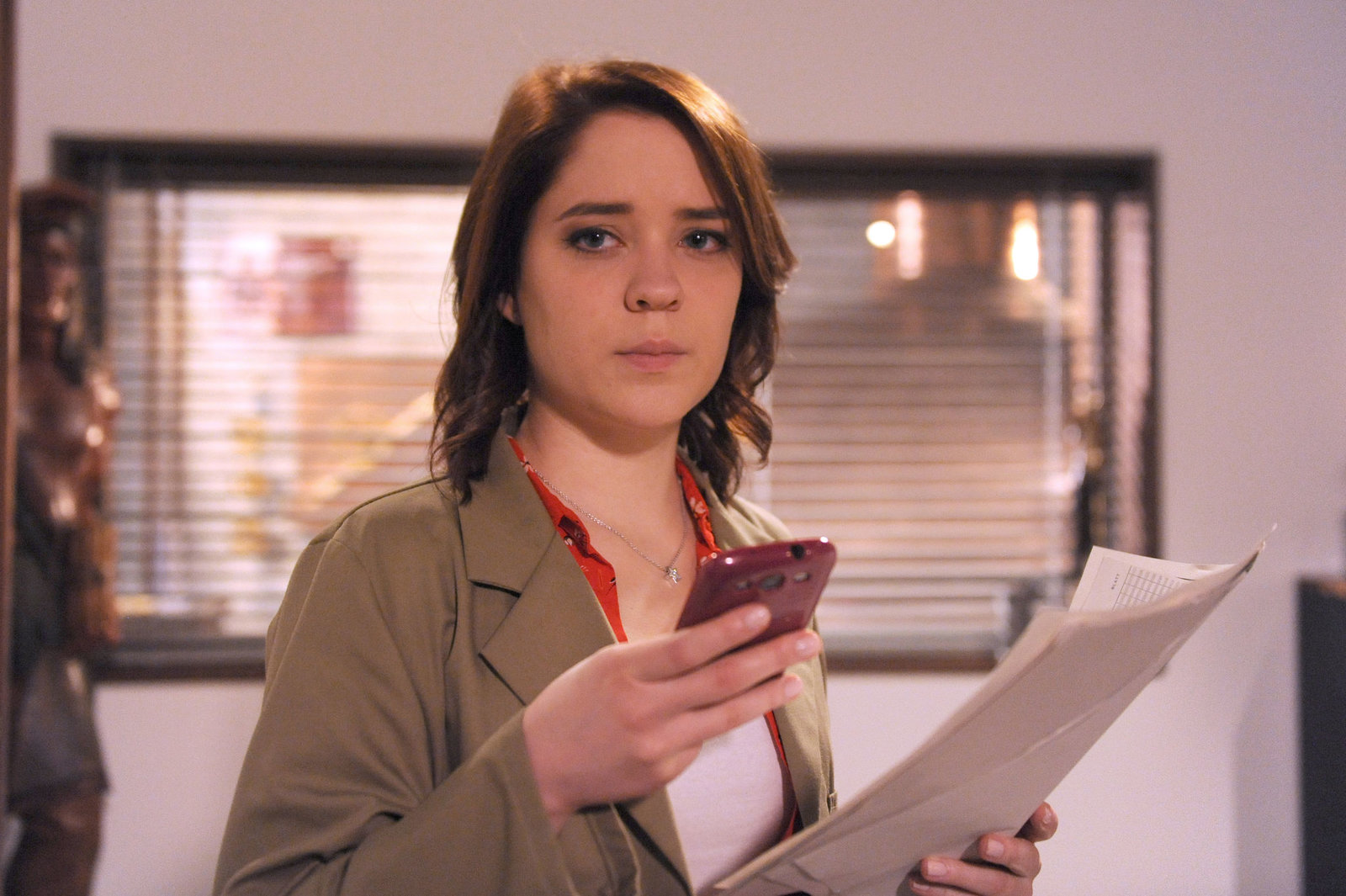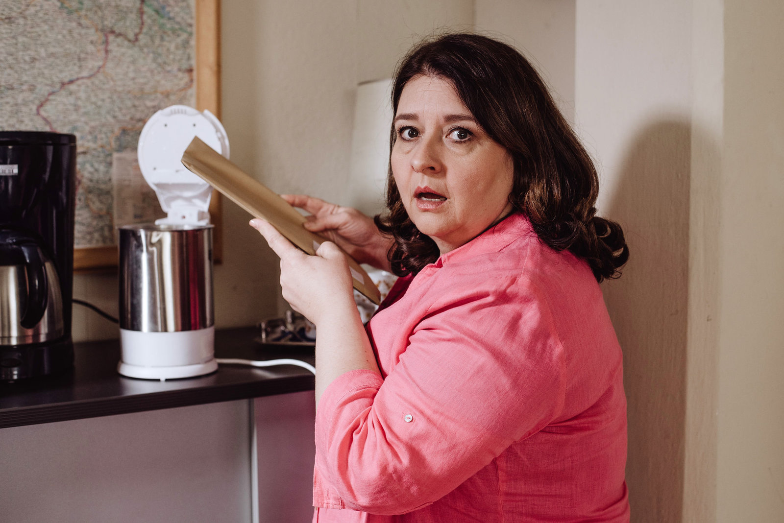 Monis VersuchungMoni (Christine Reimer) droht aufzufliegen, als Vroni überraschend in die Amtsstube kommt.Bild: © Nadya Jakobs