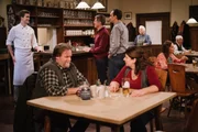 FleischeslustRoland und Mike haben nicht gemerkt, dass sie statt des teuren Kobe-Steaks ein gewöhnliches Lansinger Rind auf dem Teller hatten. Von links: Patrick Westenrieder (Lucas Bauer), Benedikt Stadlbauer (Andreas Geiss), Roland Bamberger (Horst Kummeth), Mike Preissinger (Harry Blank), Monika Vogl (Christine Reimer), Theresa Brunner (Ursula Erber), Trixi Preissinger (Doreen Dietel) und KLD.Bild: © BR/Nadya Jakobs