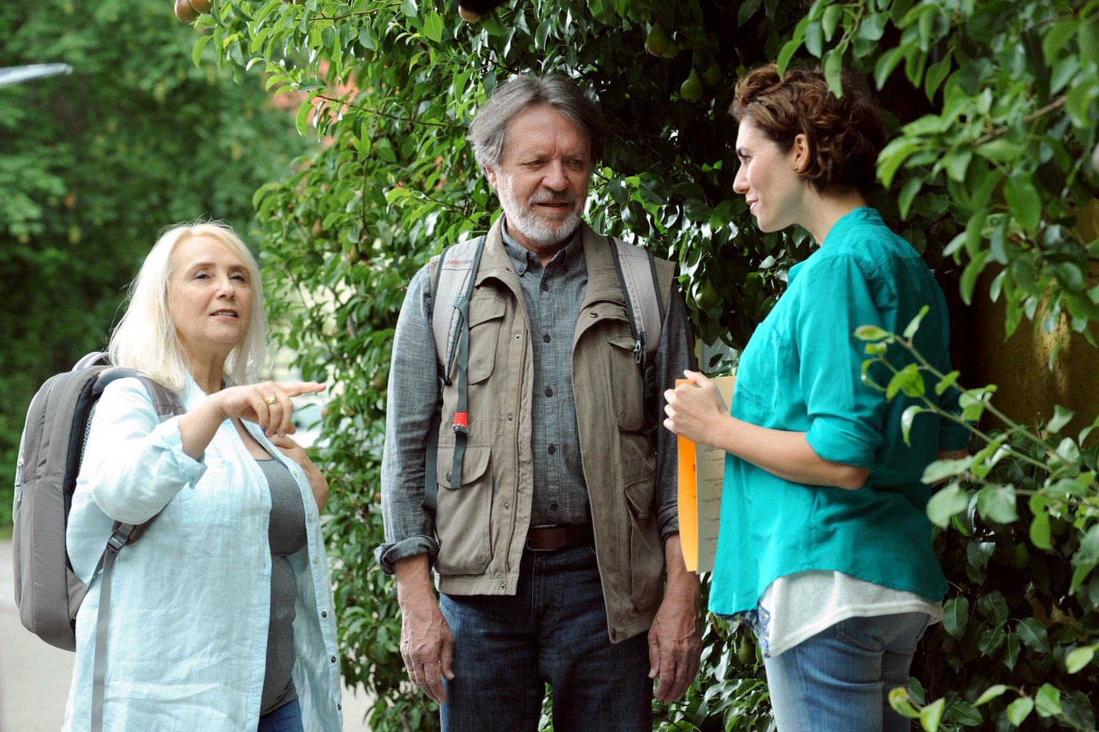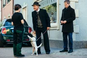 Monis KlassentreffenToni und Bamberger freuen sich, dass Schattenhofer und Hund Brunhilde sich doch noch angefreundet haben. Von links: Antonia Sturm (Jessica Lenz), Lorenz Schattenhofer (Werner Rom) und Roland Bamberger (Horst Kummeth).Bild: © BR/Nadya Jakobs