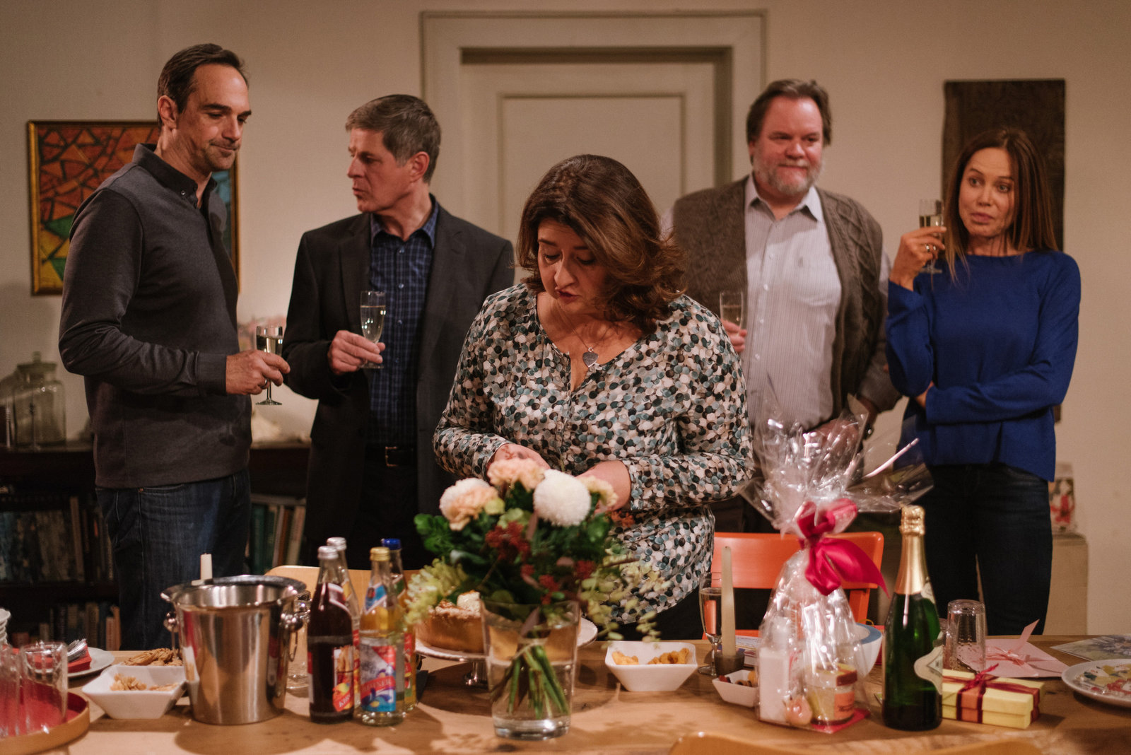 Angst vor dem DahoamDie Lansinger bereiten ein schönes Essen für Fannys Geburtstag vor. Von links: Mike Preissinger (Harry Blank), Roland Bamberger (Horst Kummeth), Monika Vogl (Christine Reimer), Benedikt Stadlbauer (Andreas Geiss) und Trixi Preissinger (Doreen Dietel).Bild: © BR/Nadya Jakobs