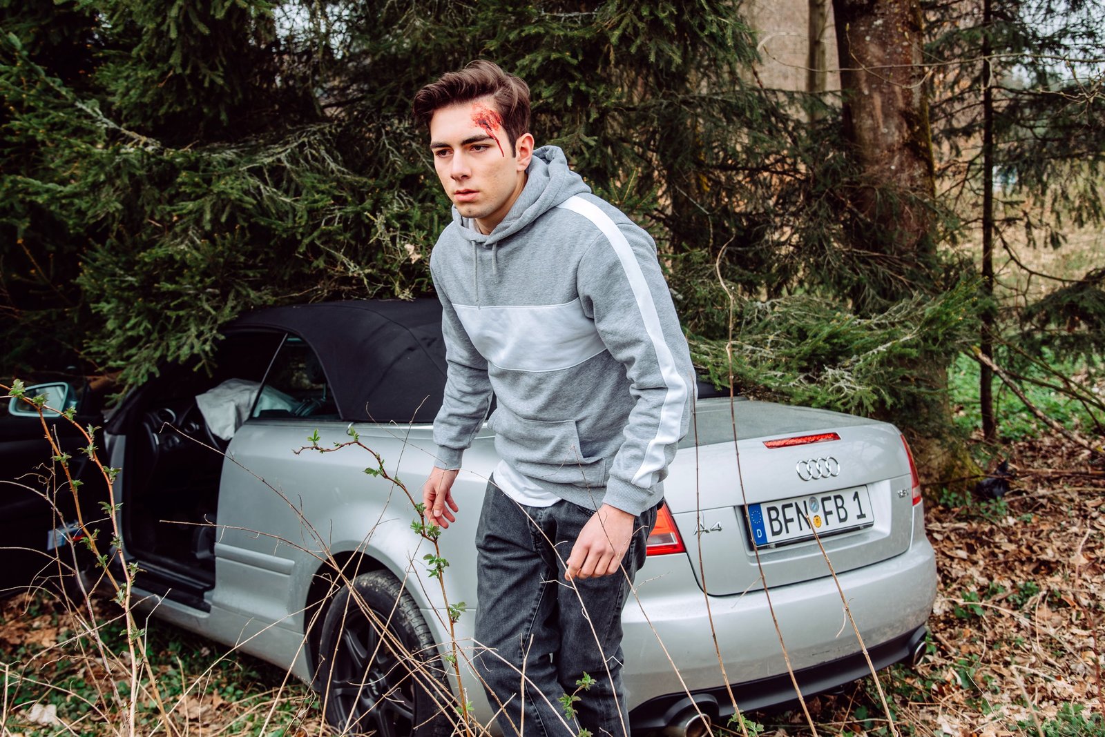 Gute MieneFelix (Shayan Hartmann) baut einen Autounfall.Bild: © BR/Nadya Jakobs
